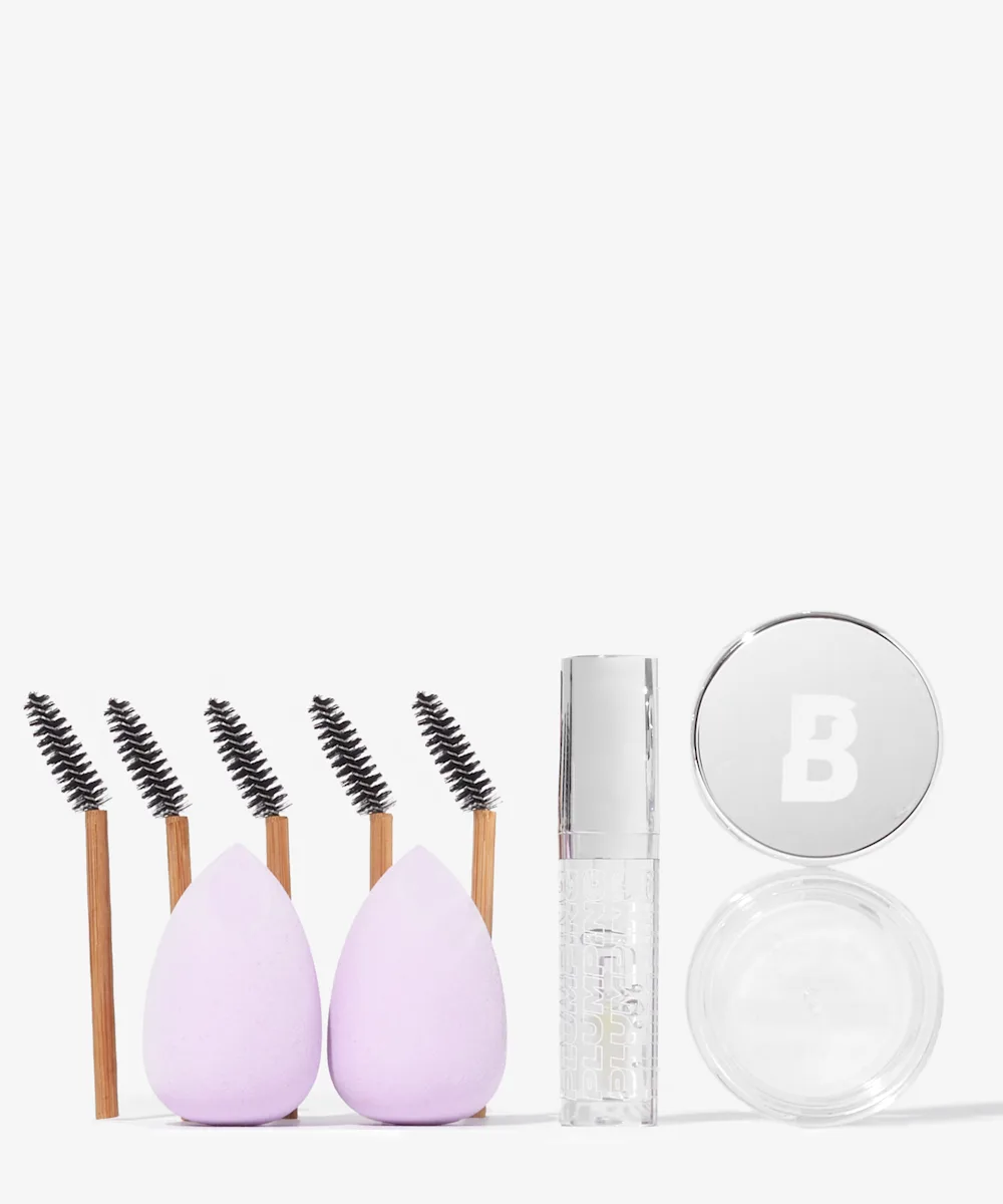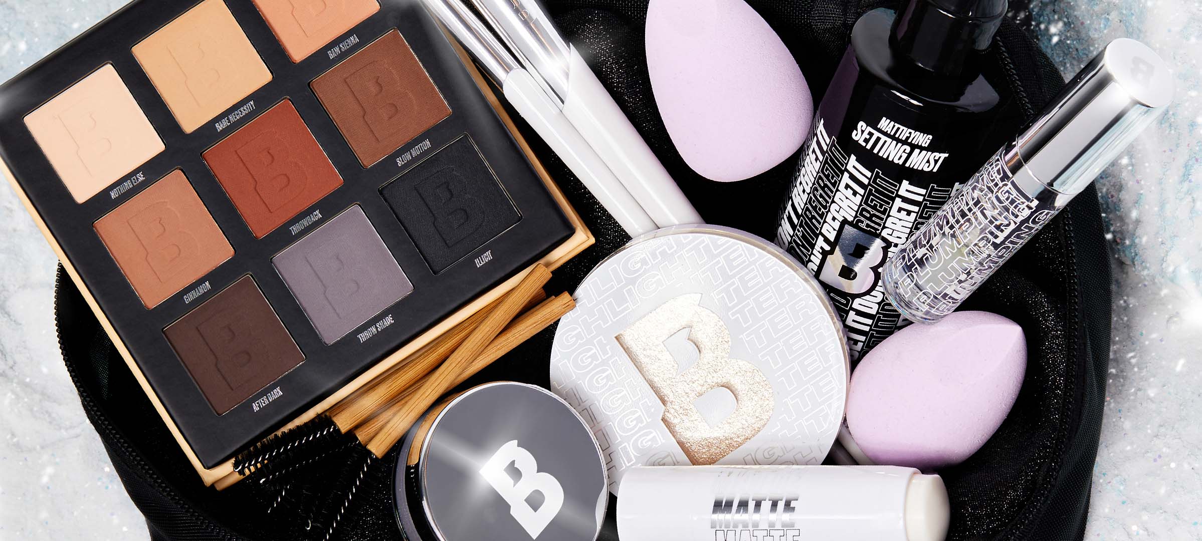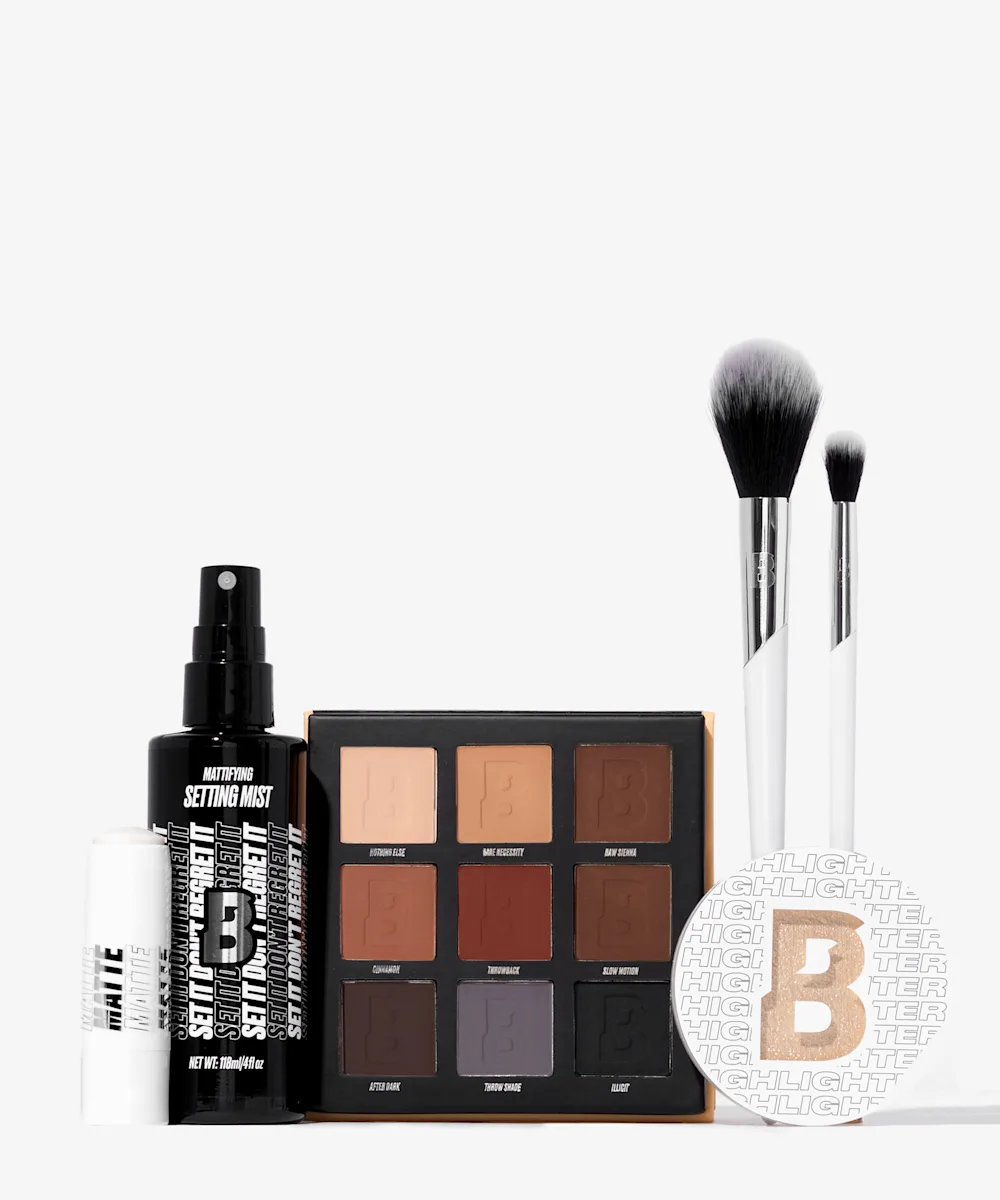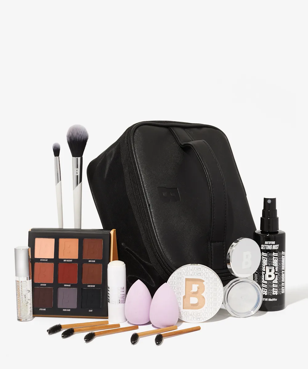 A limited-edition sleek black makeup bag with ten makeup products and tools inside.