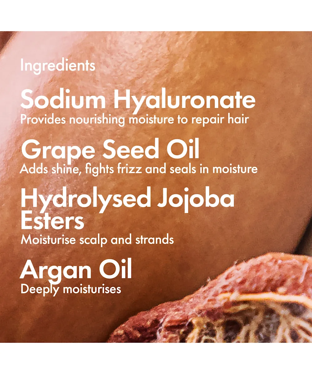 Aloe Barbadensis (Aloe Vera) Leaf Juice, Glycerin, Coco-Caprylate, Cetearyl Alcohol, Behentrimonium Chloride, Argania Spinosa (Argan) Kernel Oil, Queensland Nut (Macadamia Ternifolia) Seed Oil, Cocos Nucifera (Coconut) Oil, Persea Gratissima (Avocado) Oil, Prunus Amygdalus Dulcis (Sweet Almond) Oil, Vitis Vinifera (Grape) Seed Oil, Squalane, Propanediol, Panthenol (Pro Vitamin B5), Sodium Hyaluronate, Hydrolyzed Jojoba Esters, Caprylic/Capric Triglyceride, Hydrolyzed Adansonia Digitata (Baobab) Seed Extract, Hydrolyzed Quinoa, Althaea Rosea (Marshmallow) Root Extract, Saccharum Officinarum (Sugarcane) Extract, Acetum (Vinegar), Urtica Dioica (Nettle) Leaf Extract, Malva Sylvestris (Mallow) Flower Extract, Centella Asiatica (Gotu Kola) Extract*, Tocopherol (Vitamin E), Equisetum Arvense (Horsetail) Leaf Extract, Hydroxypropyl Guar Hydroxypropyltrimonium Chloride, Niacinamine (Vitamin B3), Polyquaternium-10, Polyquaternium-7, Aqua, Ethylhexylglycerin, Fragrance, Sodium Benzoate, Potassium Sorbate, Pentylene Glycol, Caprylyl Glycol, Citric Acid. *Certified Organic Ingredients