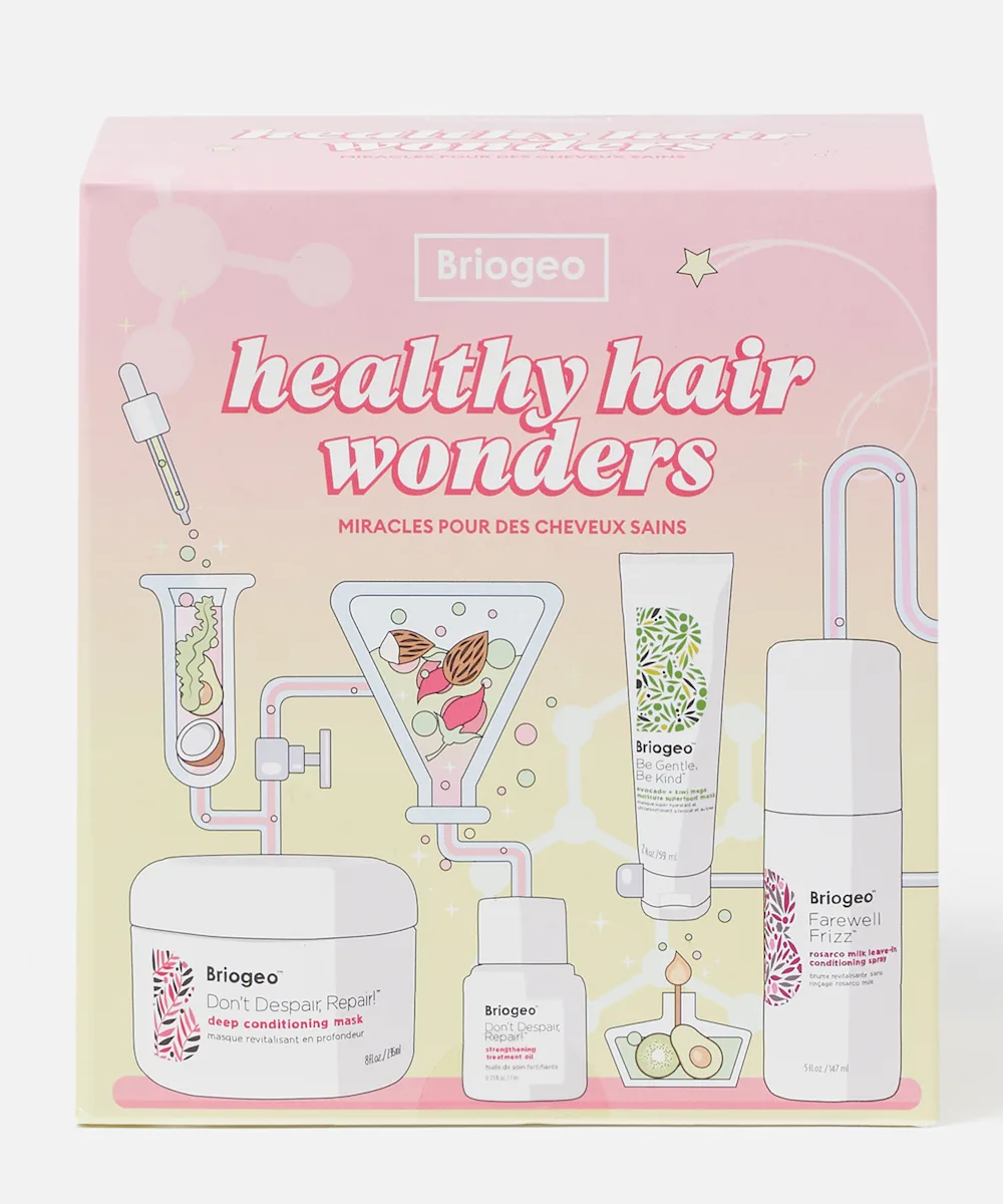 Upgrade your hair care routine with the Briogeo Healthy Hair Wonders set. Featuring four best-selling hair products to strengthen, nourish, and smooth dry and damaged hair, this set is perfect for trying your next haircare must-haves. Packed with super nourishing ingredients and Briogeo’s high strength NOVA complex, this set includes a deep conditioning mask, scientifically proven to decrease hair breakage after two uses, a leave-in conditioning spray to lock out frizz-causing humidity, an avocado and kiwi moisturising mask that adds a boost of moisture and a hair oil to repairs damage and bond split ends.
