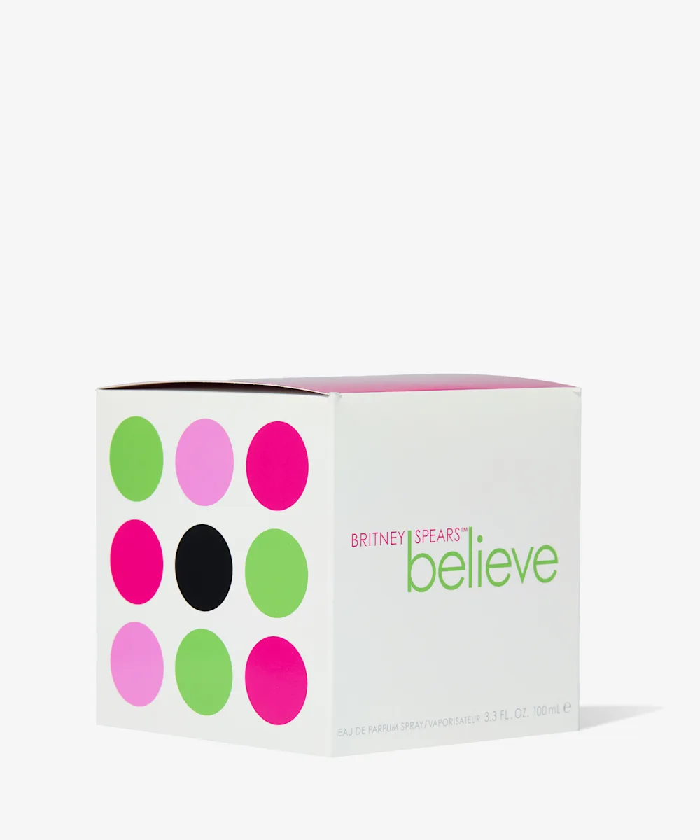 Believe in yourself when you spritz on the Britney Spears Believe EDP Spray. Sensual and warm, this fragrance opens with the zesty juiciness of tangerine and guava, followed by the sweetness of lime blossom and honeysuckle. As this delicate and feminine fragrance develops, the base notes reveal a creamy blend of patchouli, amber, and praline to add depth and texture.