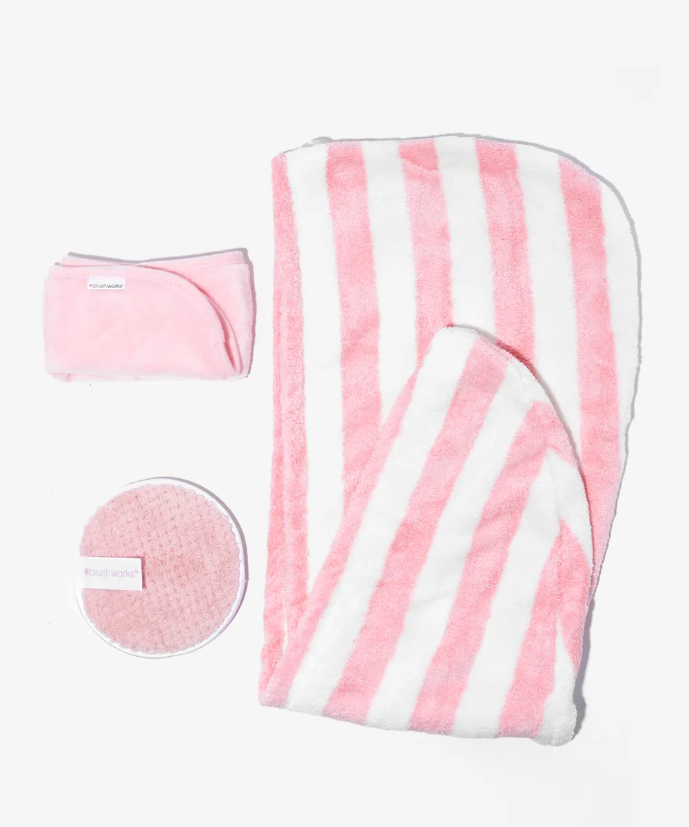 Get all your beauty essentials in once place with the Brushworks Cleanse & Pamper Set. Inside this set you’ll find an innovative makeup cloth that removes stubborn makeup with just water, a reusable makeup pad, and a luxury hair towel that gently secures freshly washed hair with a simple twist.