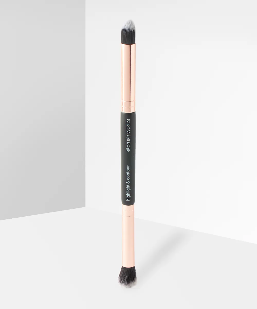 Add sculpt and glow to your makeup looks with the Brushworks Highlight & Contour Brush. This double-ended face brush is the ideal match for completing your makeup look. Use the highlighter end to sweep powder highlighters onto the high points of the face, whilst the contour end is perfect for adding definition to the cheeks and forehead. Suitable for use with both liquid and powder products.