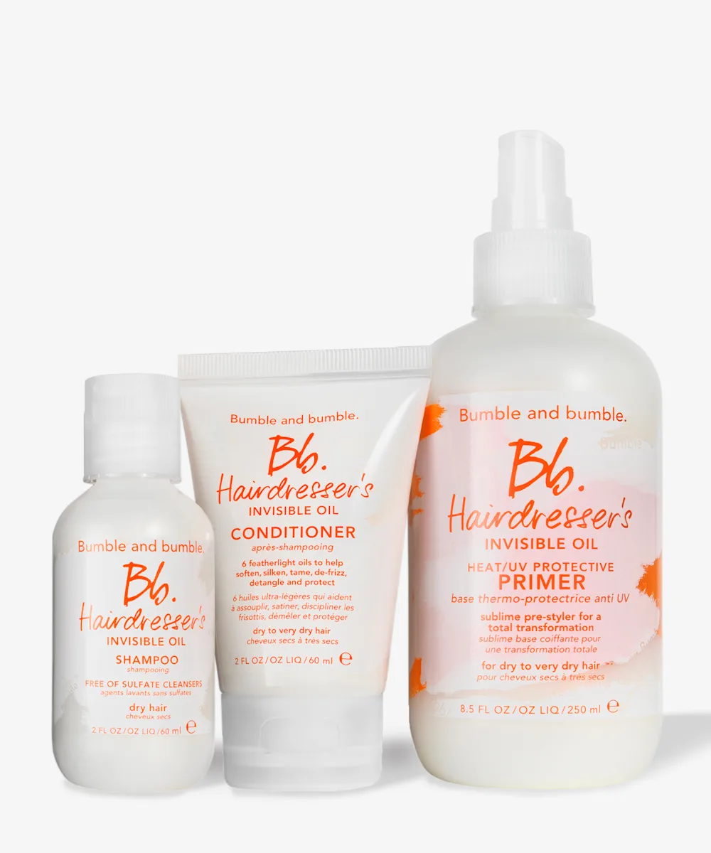 Packed full of hydrating hair must-haves infused with a featherlight 6-oil blend, the Bumble and bumble All About Hydration set belongs in your next haul. This hair-quenching ritual starts with the Invisible Oil Shampoo and Conditioner, that work together to transform dry, coarse, or brittle hair—leaving it soft and smooth, without the weight. This set also includes a Heat/UV Protective Primer to reduce frizz, add shine, and detangle. Buy now, your hair will thank us later. Suitable for all hair types