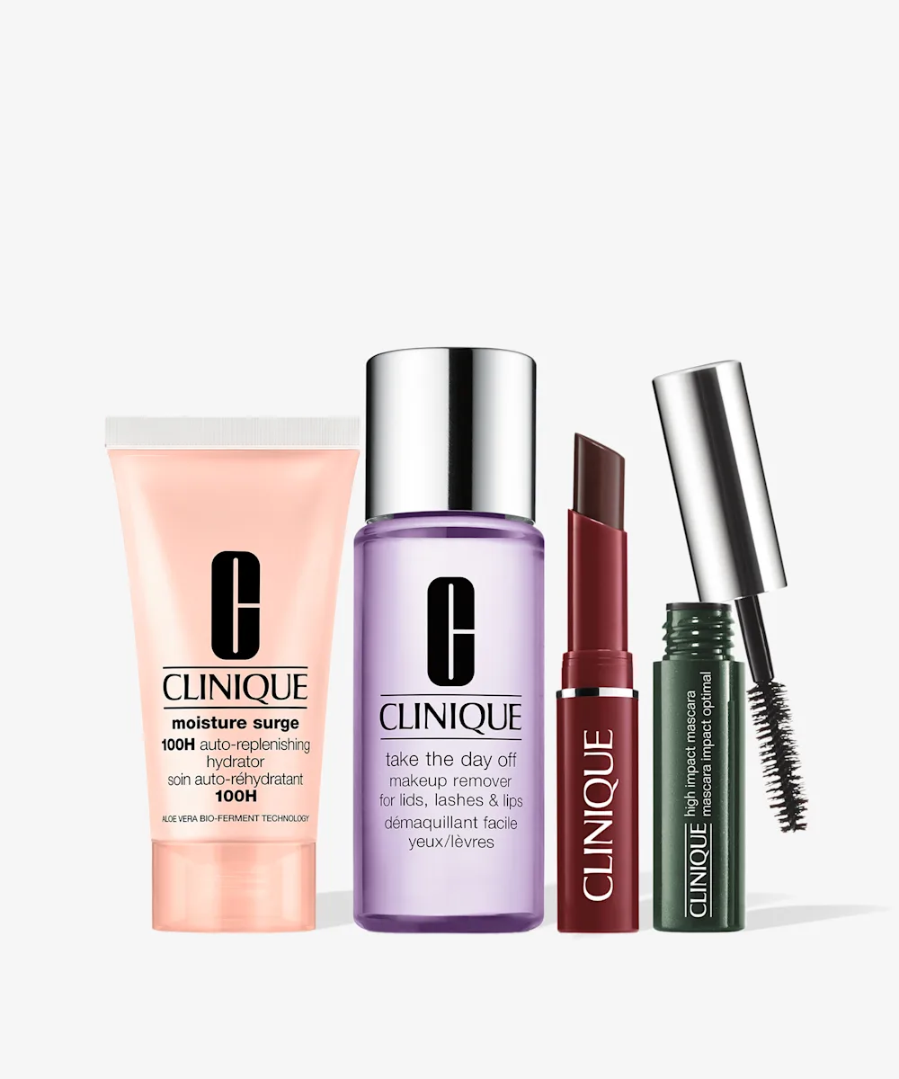 Full-size Moisture Surge™ 100H Auto-Replenishing Hydrator: Water\Aqua\Eau , Dimethicone , Butylene Glycol , Glycerin , Trisiloxane , Trehalose , Sucrose , Ammonium Acryloyldimethyltaurate/Vp Copolymer , Hydroxyethyl Urea , Camellia Sinensis (Green Tea) Leaf Extract , Silybum Marianum (Lady'S Thistle) Extract , Betula Alba (Birch) Bark Extract , Saccharomyces Lysate Extract , Aloe Barbadensis Leaf Water , Aloe Barbadensis Leaf Extract , Thermus Thermophillus Ferment , Caffeine , Sorbitol , Palmitoyl Hexapeptide-12 , Sodium Hyaluronate , Caprylyl Glycol , Oleth-10 , Sodium Polyaspartate , Aloe Barbadensis Leaf Polysaccharides , Lactobacillus Ferment Lysate , Saccharide Isomerate , Hydrogenated Lecithin , Tocopheryl Acetate , Acrylates/C10-30 Alkyl Acrylate Crosspolymer , Glyceryl Polymethacrylate , Tromethamine , Peg-8 , Hexylene Glycol , Magnesium Ascorbyl Phosphate , Citric Acid , Bht , Disodium Edta , Sodium Citrate , Potassium Sorbate , Sodium Benzoate , Phenoxyethanol , Red 4 (Ci 14700) , Yellow 5 (Ci 19140). Almost Lipstick in Black Honey: Ricinus Communis (Castor) Seed Oil, Glyceryl Triacetyl Ricinoleate, Cetyl Ricinoleate, Euphorbia Cerifera (Candelilla) Wax\Candelilla Cera\Cire De Candelilla, Copernicia Cerifera (Carnauba) Wax\Cera Carnauba\Cire De Carnauba, Polyethylene, Tocopheryl Acetate, Pentaerythrityl Tetra-Di-T-Butyl Hydroxyhydrocinnamate, Barium Sulfate, [+/- Yellow 5 Lake (Ci 19140), Blue 1 Lake (Ci 42090), Iron Oxides (Ci 77491, Ci 77492, Ci 77499), Red 7 Lake (Ci 15850), Mica, Carmine (Ci 75470), Titanium Dioxide (Ci 77891), Red 6 (Ci 15850), Red 22 Lake (Ci 45380), Red 30 Lake (Ci 73360), Yellow 6 Lake (Ci 15985), Bismuth Oxychloride (Ci 77163), Red 33 Lake (Ci 17200), Red 28 Lake (Ci 45410)] High Impact™ Mascara in Black: Water\Aqua\Eau, Copernicia Cerifera (Carnauba) Wax\ Copernicia Cerifera Cera \Cire De Carnauba, Stearic Acid, Glyceryl Stearate, Polyisobutene, Silica, Acrylates Copolymer, Aminomethyl Propanediol, Vp/Eicosene Copolymer, Sodium Hyaluronate, Lauroyl Lysine, Pantethine, Melanin, Panthenol, Ethylhexylglycerin, Hydroxyethylcellulose, Calcium Aluminum Borosilicate, Pvp, Acacia Senegal Gum, Isostearic Acid, Simethicone, Dimethicone Peg-8 Polyacrylate, Urea, Glycerin, Pentaerythrityl Tetra-Di-T-Butyl Hydroxyhydrocinnamate, Sodium Lauryl Sulfate, Peg-8 Dimethicone, Disodium Edta, Sorbic Acid, Chlorphenesin, Sodium Dehydroacetate, Phenoxyethanol, Mica, Iron Oxides (Ci 77491), Iron Oxides (Ci 77492), Iron Oxides (Ci 77499), Bronze Powder (Ci 77400), Blue 1 Lake (Ci 42090), Titanium Dioxide (Ci 77891), Yellow 5 Lake (Ci 19140), Chromium Oxide Greens (Ci 77288), Chromium Hydroxide Green (Ci 77289), Carmine (Ci 75470), Bismuth Oxychloride (Ci 77163), Ultramarines (Ci 77007), Aluminum Powder (Ci 77000)].