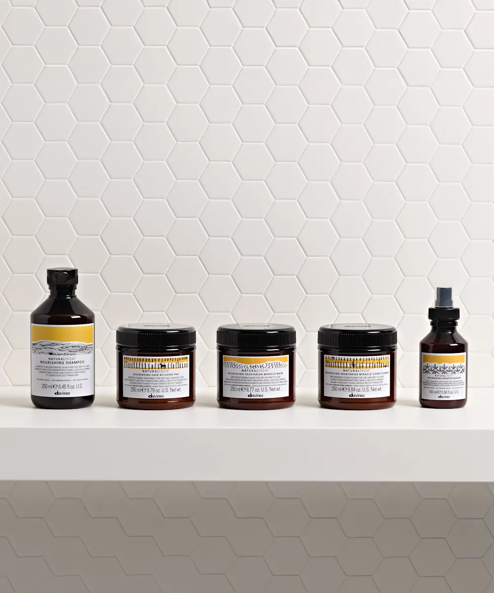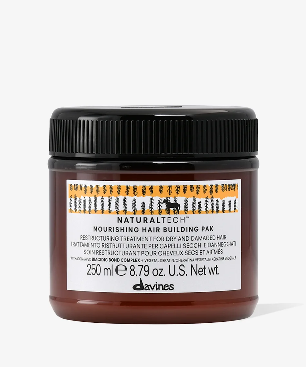 Treat your damaged hair to the Davines Nourishing Hair Building Pak. This restructuring mask is the perfect match for damaged hair, thanks to the vegetal keratin and the Biacidic Bond Complex that works to nourish the roots by strengthening and protecting each fibre.