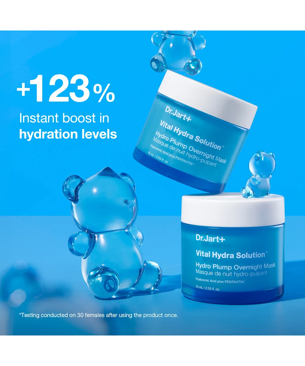 Wake up to happy and hydrated skin with the Dr. Jart+ Vital Hydra Solution Hydro Plump Overnight Mask. As you sleep, this leave-on overnight gel mask uses a nourishing blend of hyaluronic acid and pentavitin to moisturise the skin and strengthen the skin’s barrier for improved moisture and water retention. Designed to leave the complexion feeling soft and glowing with plumping hydration, this overnight mask belongs in your skincare routine.