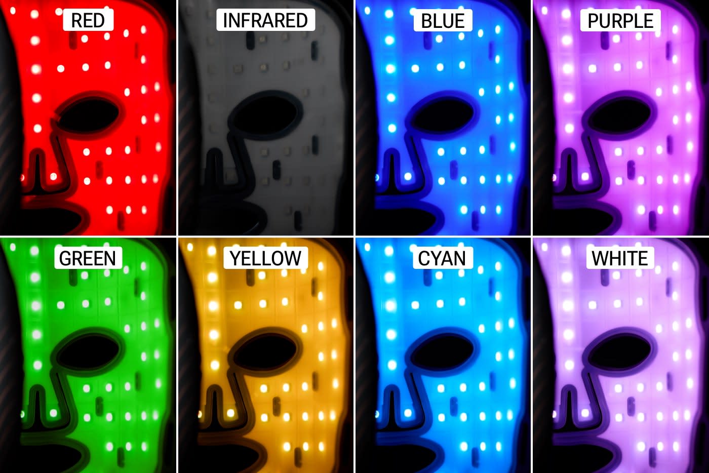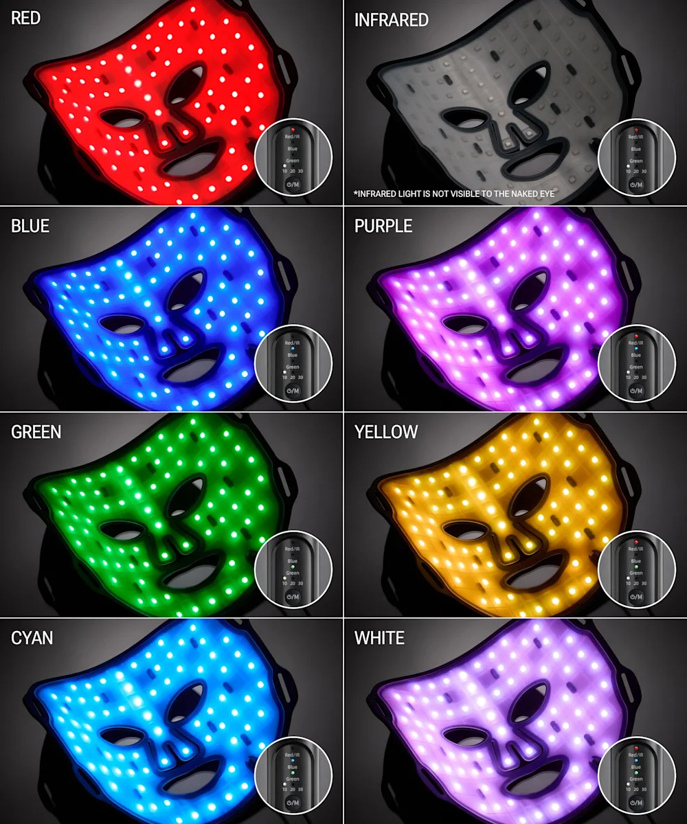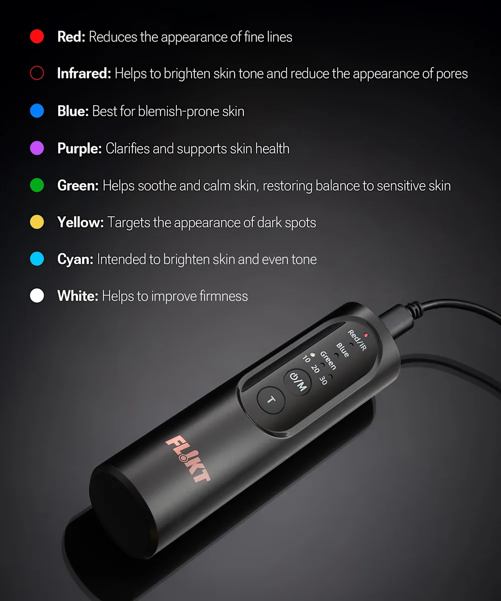 - Cyan (490nm ± 10nm): Intended to brighten skin and even tone
