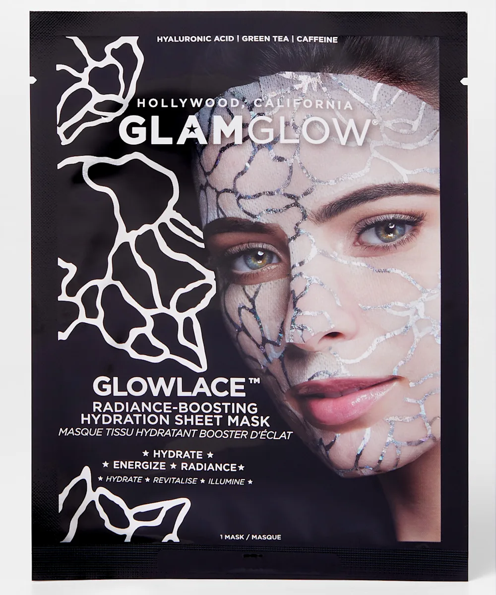 GLOWLACE Radiance-Boosting Hydration Sheet Mask: Water\Aqua\Eau, Ymethyl Gluceth-20, PEG-75, Butylene Glycol, BIS-PEG-18 Methyl Ether Dimethyl Silane, Propanediol, Sodium Hyaluronate, Tocopheryl Acetate, Caffeine, Poria Cocos Sclerotium Extract, Echinacea Purpurea (Coneflower) Extract, Camelina Sativa Seed Oil, Silybum Marianum (Lady's Thistle) Extract, Anthemis Nobilis (Chamomile) Flower Extract, Cladosiphon Okamuranus Extract, Hydrolyzed Rice Extract, Betula Alba (Birch) Extract, Coffea Arabica (Coffee) Seed Oil, Algae Extract, Artemia Extract, Hydrolyzed Algin, Lactobacillus Ferment, Squalane, Glycine, Lecithin, Glycereth-26, Sodium Hydroxide, Carbomer, Xanthan Gum, Dextrin, Caprylyl Glycol, PEG-8 Glyceryl Isostearate, Polysorbate 20, Tetrasodium Edta, Disodium Edta, Phenoxyethanol.