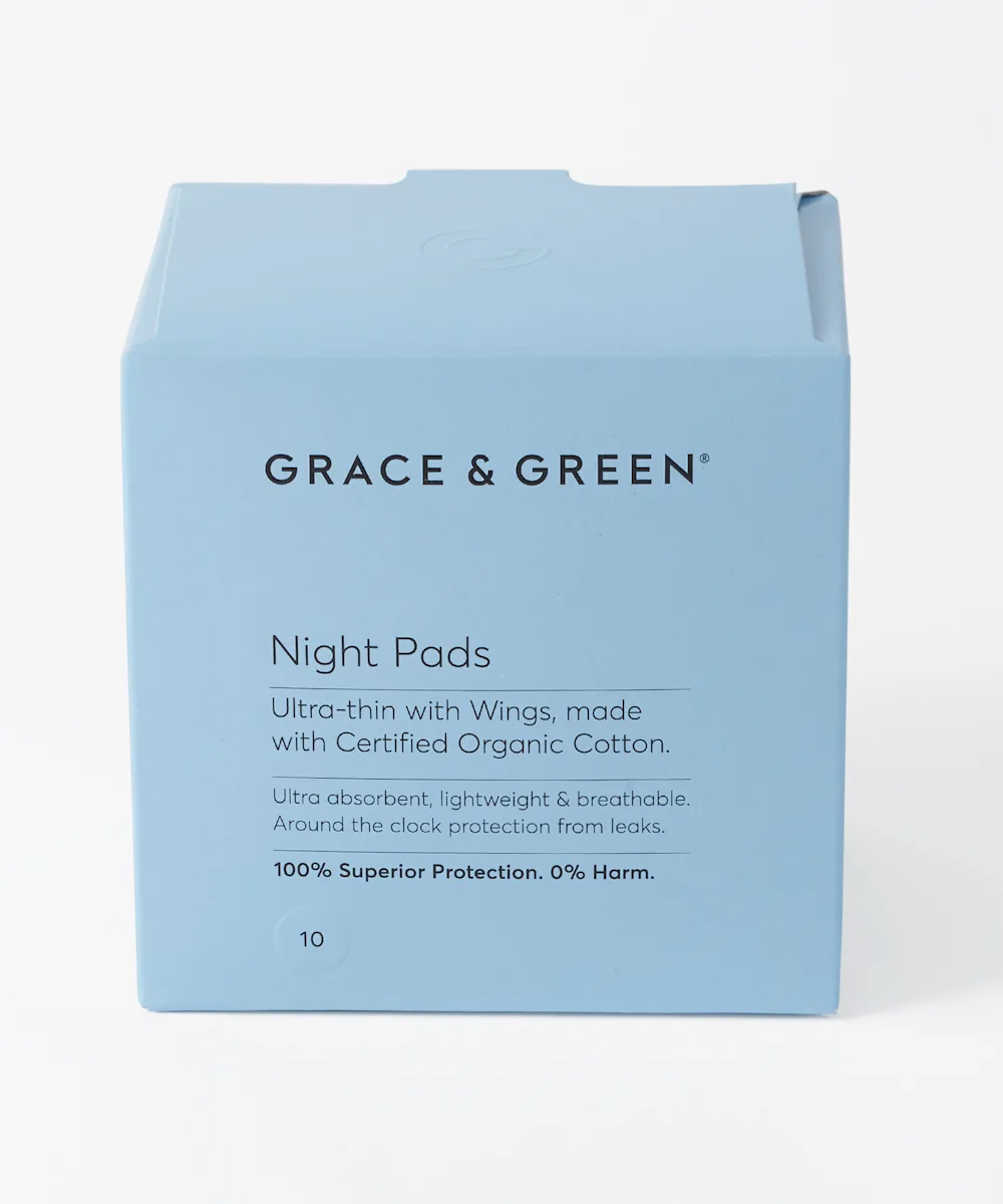 Period products that are kind to you and the environment? We’re here for it. The Grace & Green Night pads are ultra-thin, super absorbent sanitary pads with wings, for overnight comfort and protection. Each pad is made from 100% organic cotton, with a plant-based, leak-proof backing, meaning they are fully biodegradable. Each individual plastic wrapper is also biodegradable.