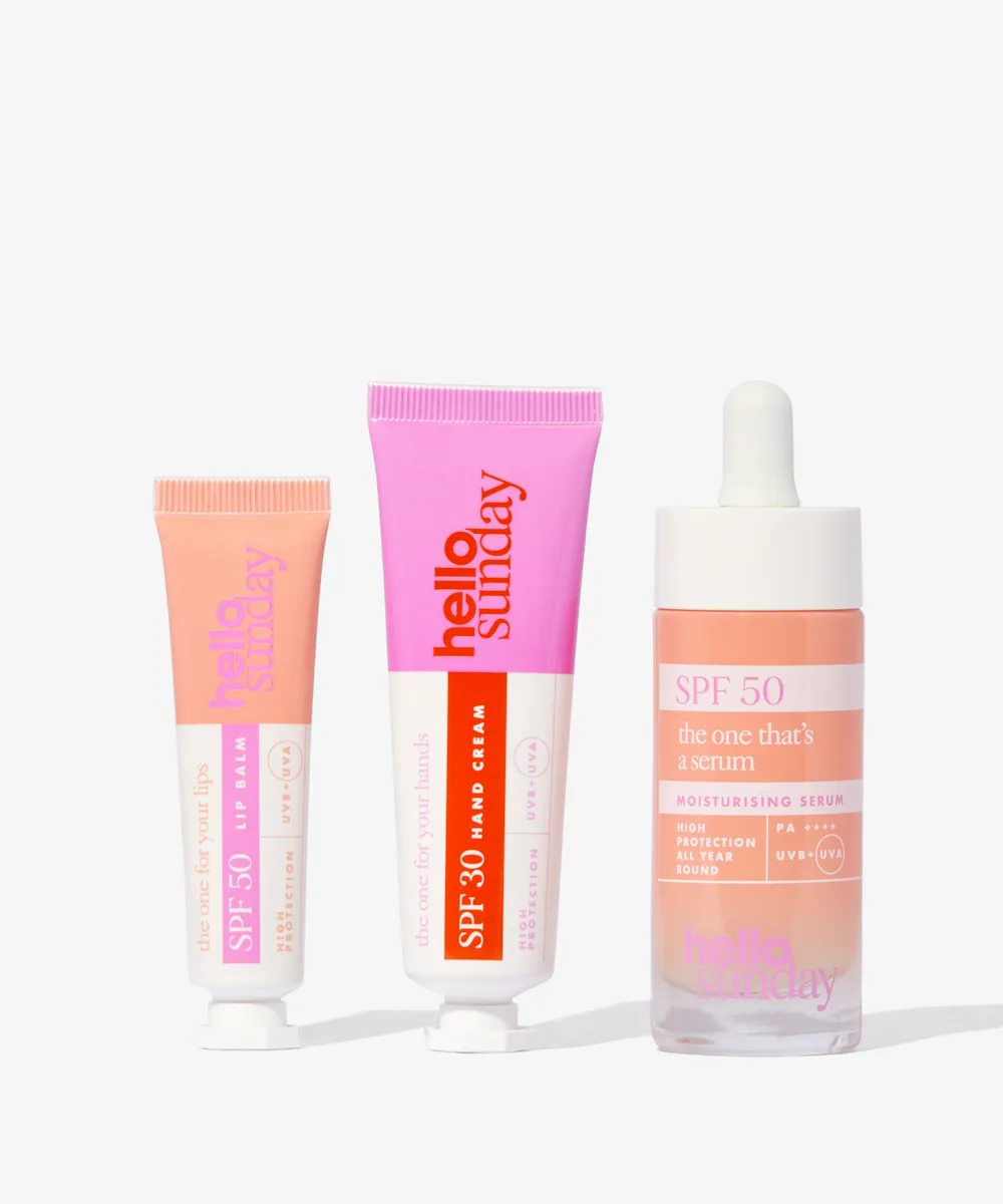 A three-piece set including an SPF50 lip balm, an SPF50 face serum and an SPF50 hand cream.
