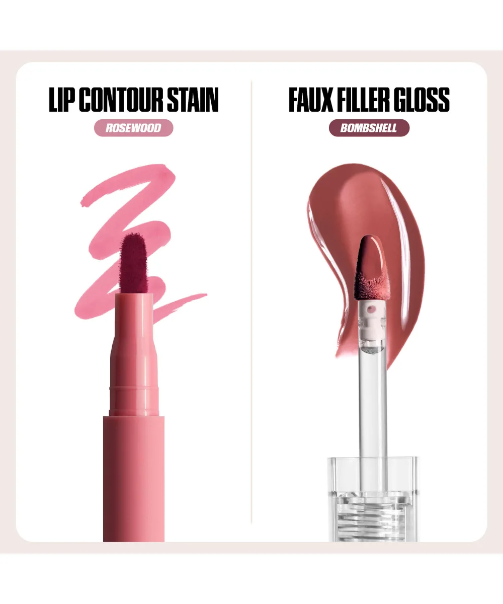 A limited edition must-have lip kit with Huda Beauty’s Lip Contour Stain and Faux Filler Lip Gloss in bestselling Bombshell for glossy stained lips that won’t budge!