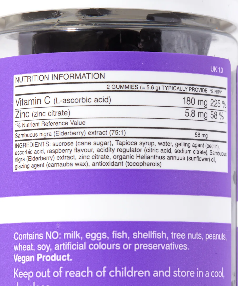Sucrose (Cane Sugar), Tapioca Syrup, Water, Gelling Agent (Pectin), Vitamin C (Ascorbic Acid 180 Mg), Raspberry Flavour, Acidity Regulator (Citric Acid, Sodium Citrate), Sambucus Nigra (Elderberry) Extract, Zinc (Zinc Citrate 5.8 Mg), Organic Helianthus Annuus (Sunflower) Oil, Glazing Agent (Carnauba Wax), Antioxidant (Tocopherols)