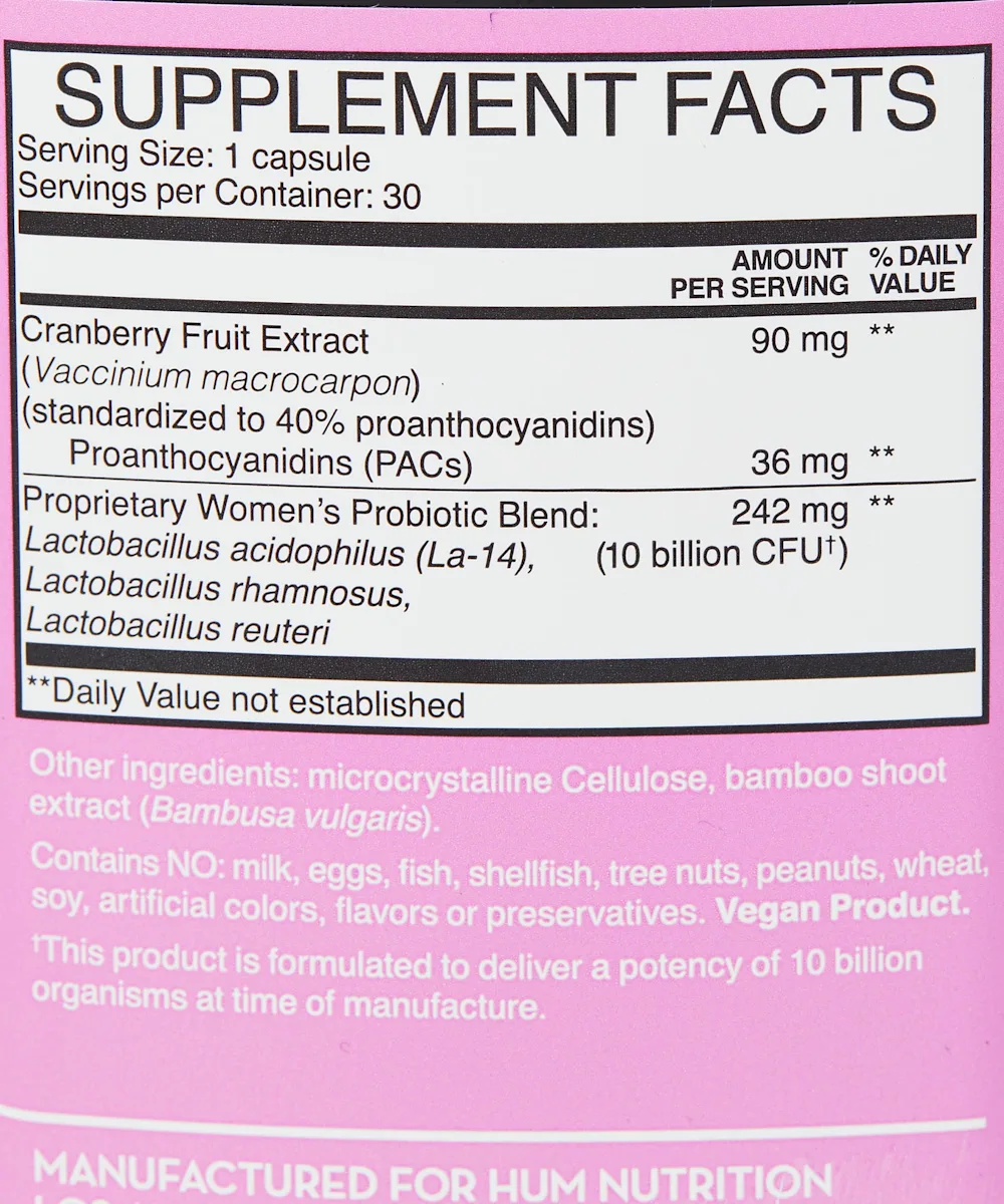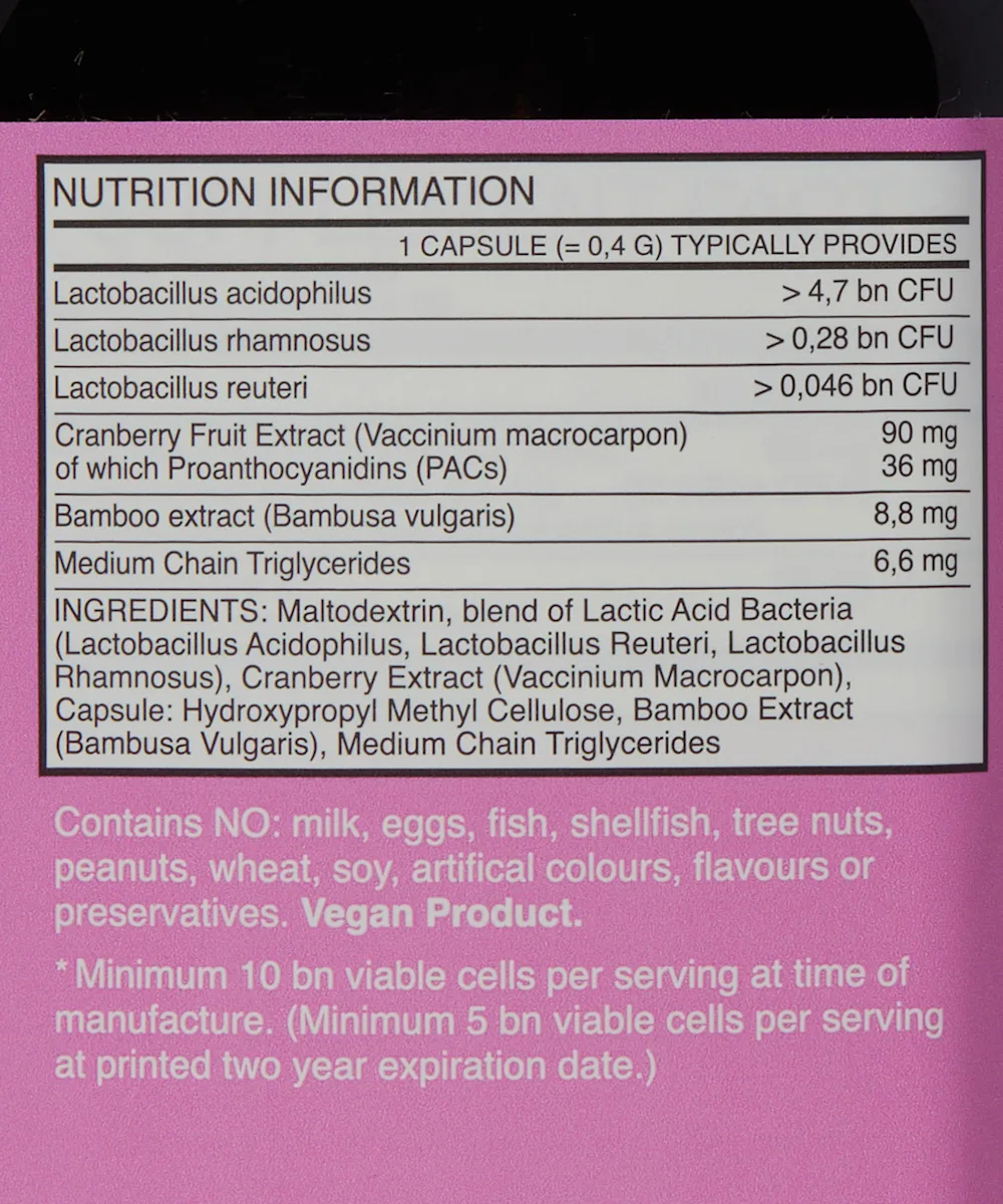 Cranberry Extract (Vaccinium macrocarpon) (fruit) (standardized to 40% proanthocyanidins) 90 mg, Proanthocyanidins (PACs) 36 mg, Proprietary women's probiotic blend 10 billion CFU* (Lactobacillus acidophilus (La-14), Lactobacillus rhamnosus, Lactobacillus reuteri). Other Microcrystalline Cellulose, Bamboo extract (Bambus vulgaris) (shoots). Contains NO: wheat, gluten, soy, milk, eggs, fish, crustacean shellfish, peanuts, artificial colors, flavors or preservatives.