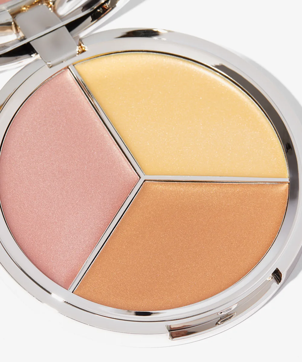 A three-pan creamy highlighter compact.
