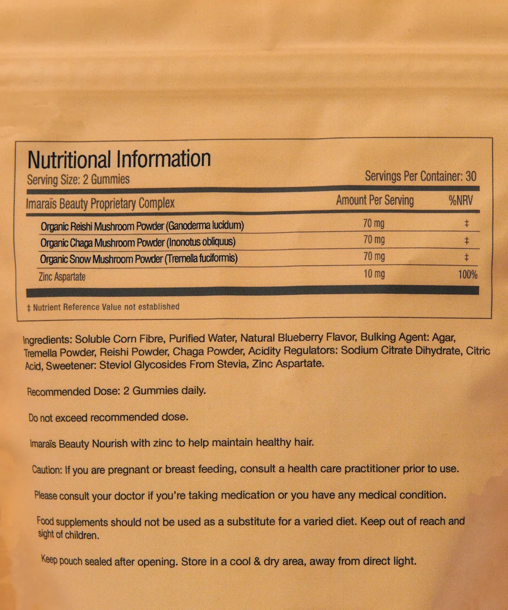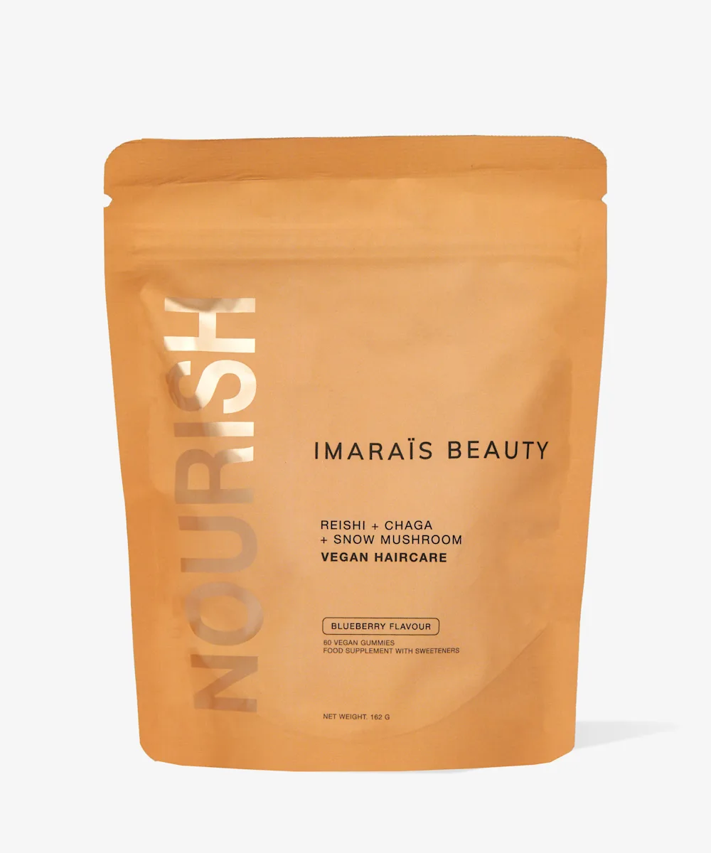 Give your hair the fuel it needs with the Imaraïs Beauty Nourish Vegan Haircare Gummies Blueberry. Combining chaga and reishi extracts with snow mushroom extracts, these vegan supplements deliver noticeably nourished results to promote stronger and fuller hair. Bursting with a yummy blueberry flavour, these nutrient-rich gummies belong in your daily routine.