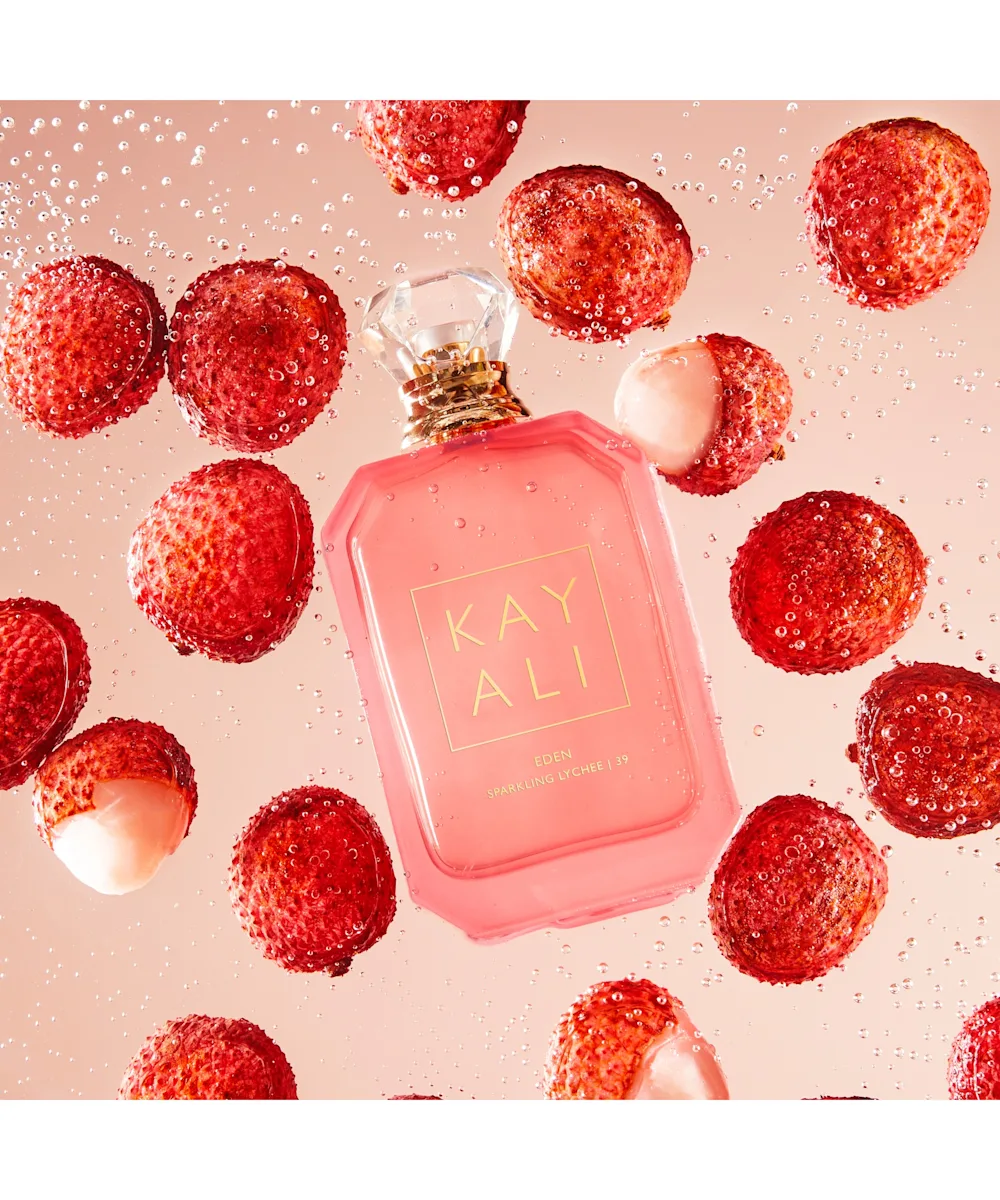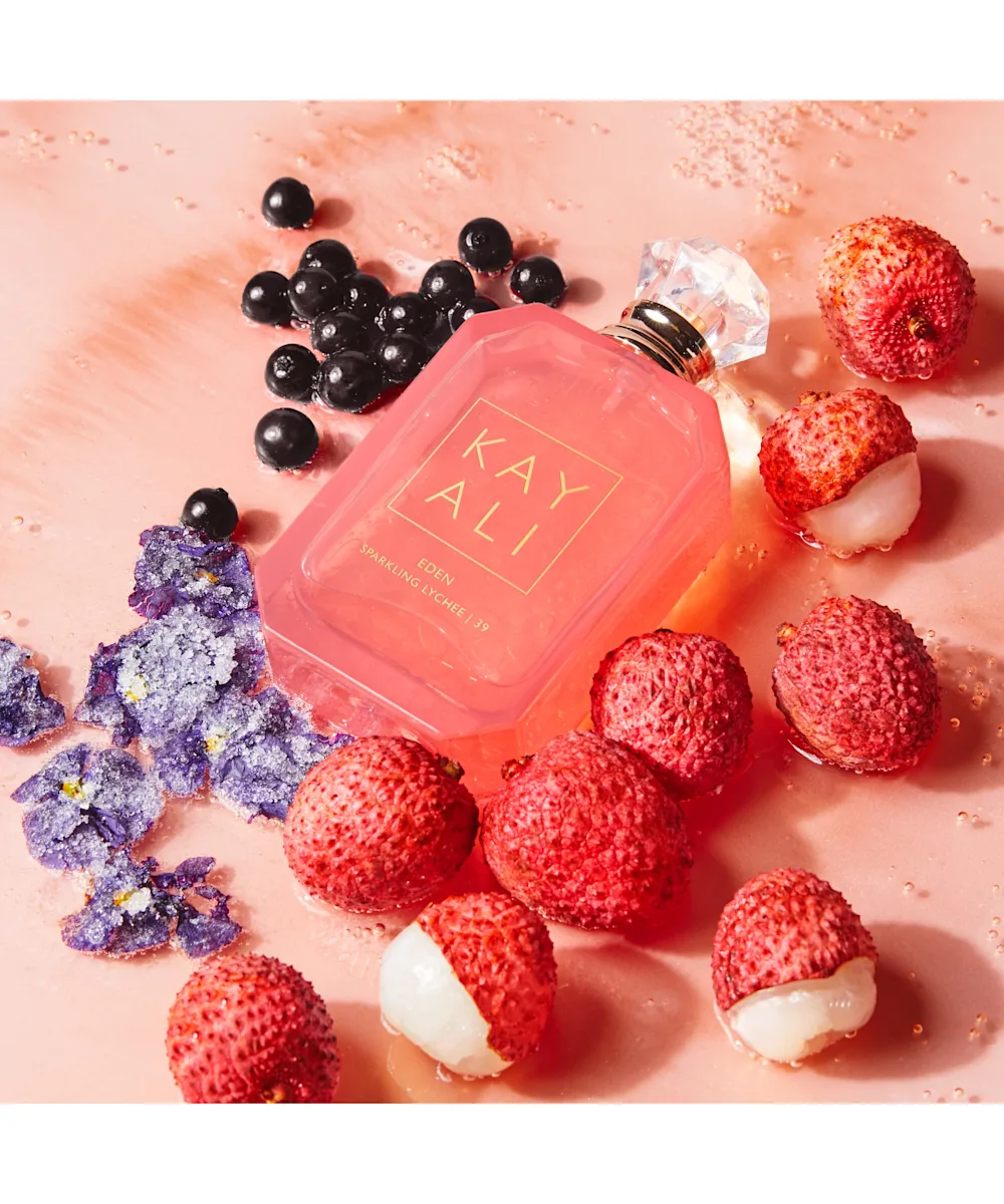 Prepare to be tempted. The Kayali Eden Sparkling Lychee| 39 Eau de Parfum is a radiant and cheerful fruity floral fragrance featuring a beautiful blend of luscious lychee, tart blackcurrant and sweet candied violet.