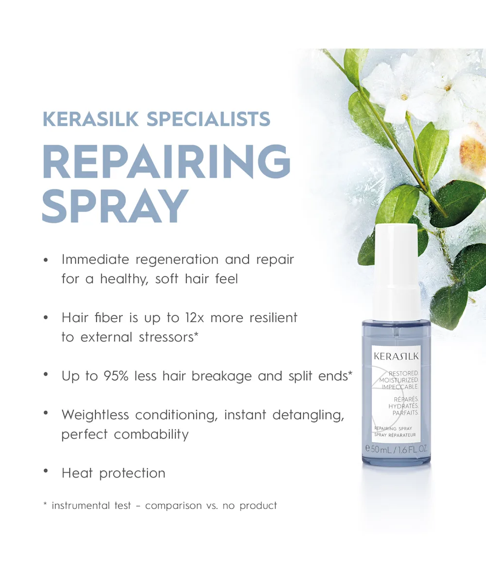 - Repairing Spray, 50 ml – A reparative spray that nourishes, restores, repairs, and conditions damaged hair, while preventing breakage, minimising split ends, and providing heat protection with a combination of biomimetic silk and hyaloveil.