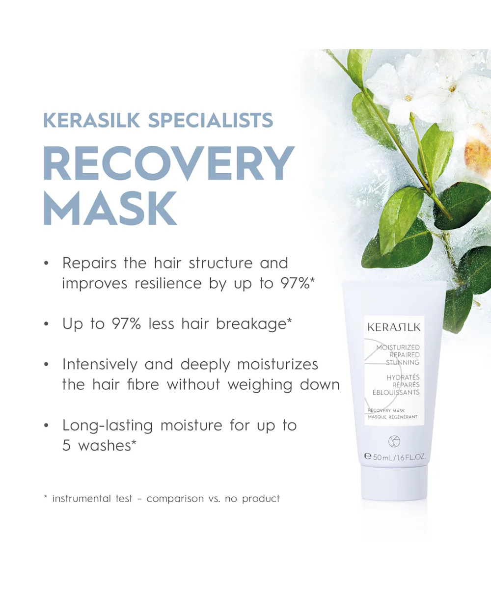 - Recovery Mask, 50 ml – A reparative hair mask that uses a hydrating blend of biomimetic silk and hyaloveil to repair and deeply nourish dry and damaged hair fibres without weighing them down, as well as repairing hair structure, enhancing resilience, and preventing breakage.