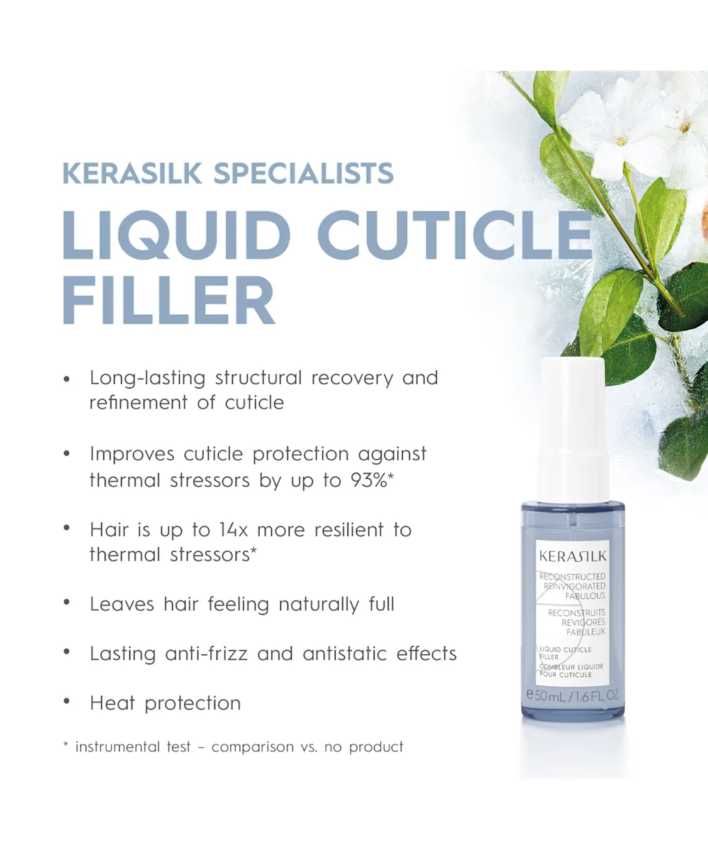 - Liquid Cuticle Filler, 50 ml - A cuticle-refining, heat-activated spray that works to rebuild and maximise the hair surface to revive, restore, and refine the cuticle with a blend of biomimetic silk and blue lotus extract.