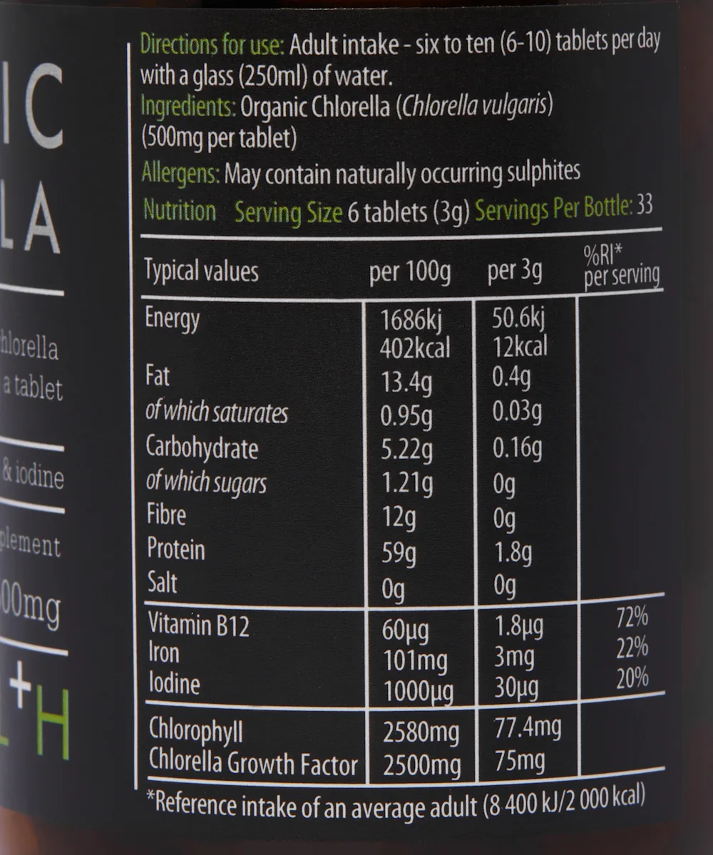 Organic Chlorella (500mg per tablet) Allergens: May contain naturally occurring sulphites. Suitable for vegetarians and vegans. No artificial colours, preservatives, sweeteners or fillers.