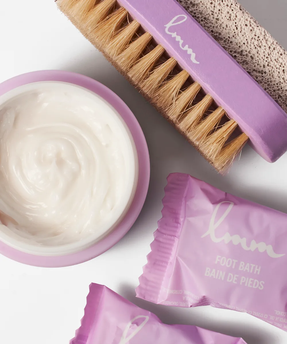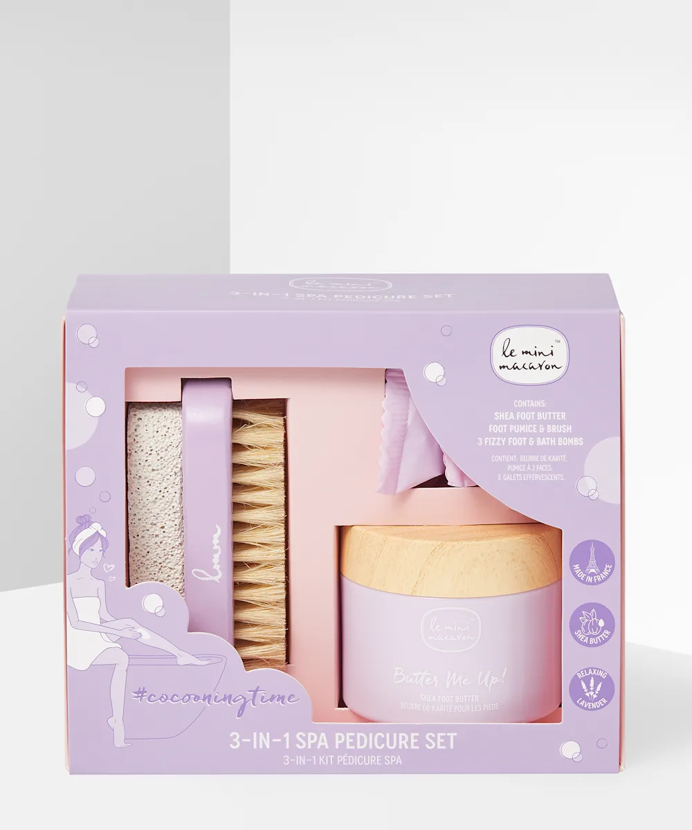 Bring the spa to you and indulge your feet in a home pedicure with the Cocooning Time 3-in-1 Spa Pedicure Set. Featuring everything you need to pamper and care for your hard-working feet, the set includes three Fizzy Foot and Bath Bombs with a lavender aroma to relax and refresh; a full sized Butter Me Up Shea Foot Butter to deeply hydrate, repair and fortify dry and rough skin; and a unique, double-sided pumice and foot brush to clean and exfoliate while gently scrubbing away rough, calloused skin. Serious spa vibes!