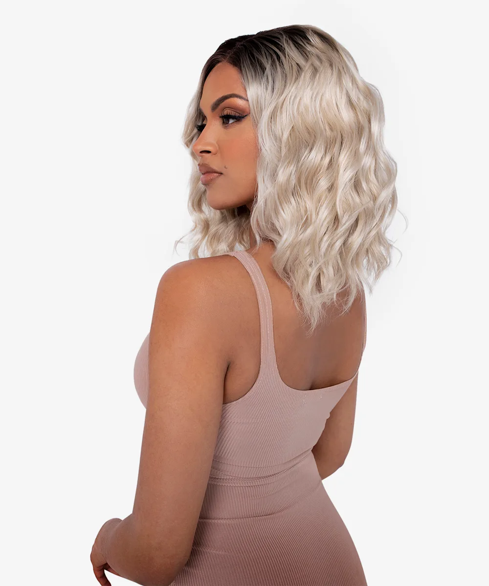 A wavy and ash-blonde 17.5” lace front wig.