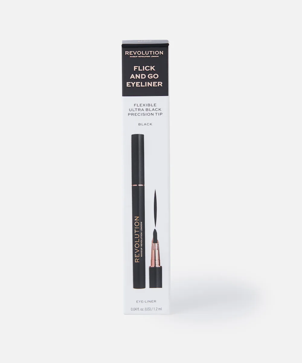 Get the perfect wing in seconds with the Revolution Flick and Go Eyeliner. This unique, angled, precision felt tip makes quick work of sculpting the perfect liquid liner. The long lasting, ultra-black formula will last all day.