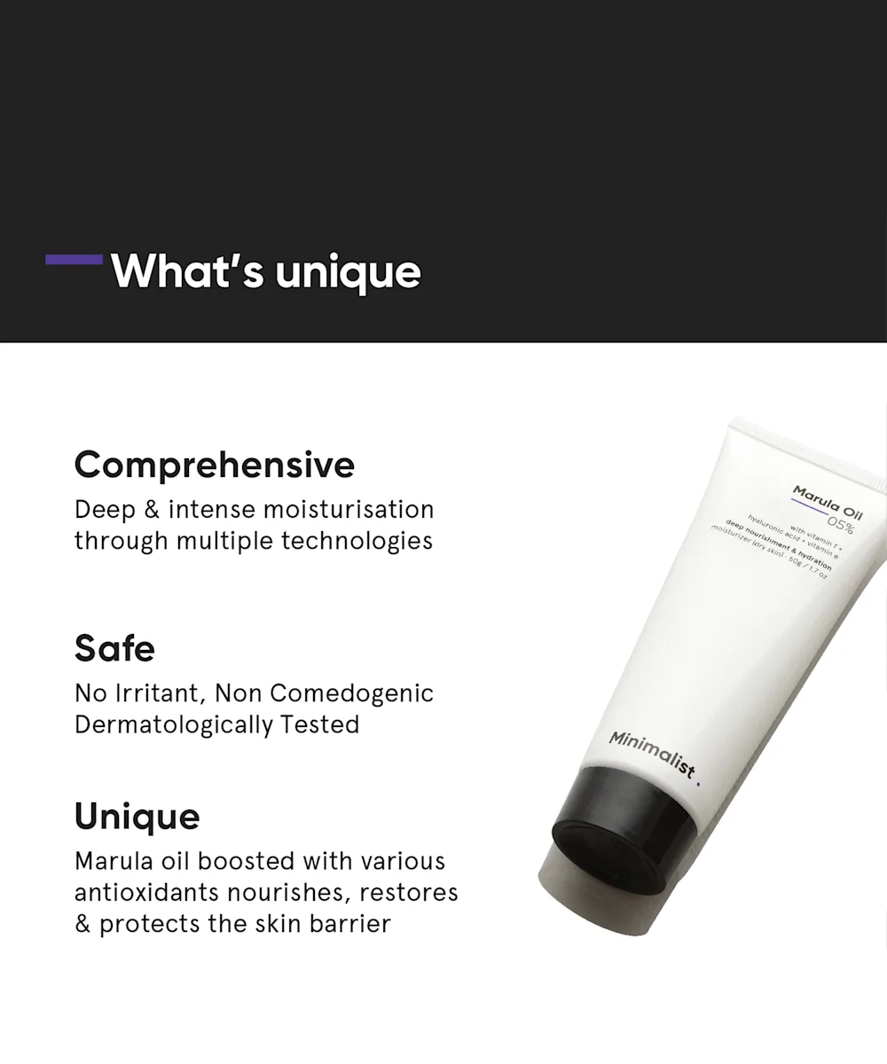For deep and intense moisturisation, reach for the Minimalist Marula Oil 5% Moisturizer. Working to treat dryness, roughness and flakiness, this heavy moisturising cream is enriched with softening and revitalising 5% Marula Oil, nourishing vitamins F and E, plus hydrating hyaluronic acid and glycerin. FYI: this cream is perfect for dry or damaged skin types.