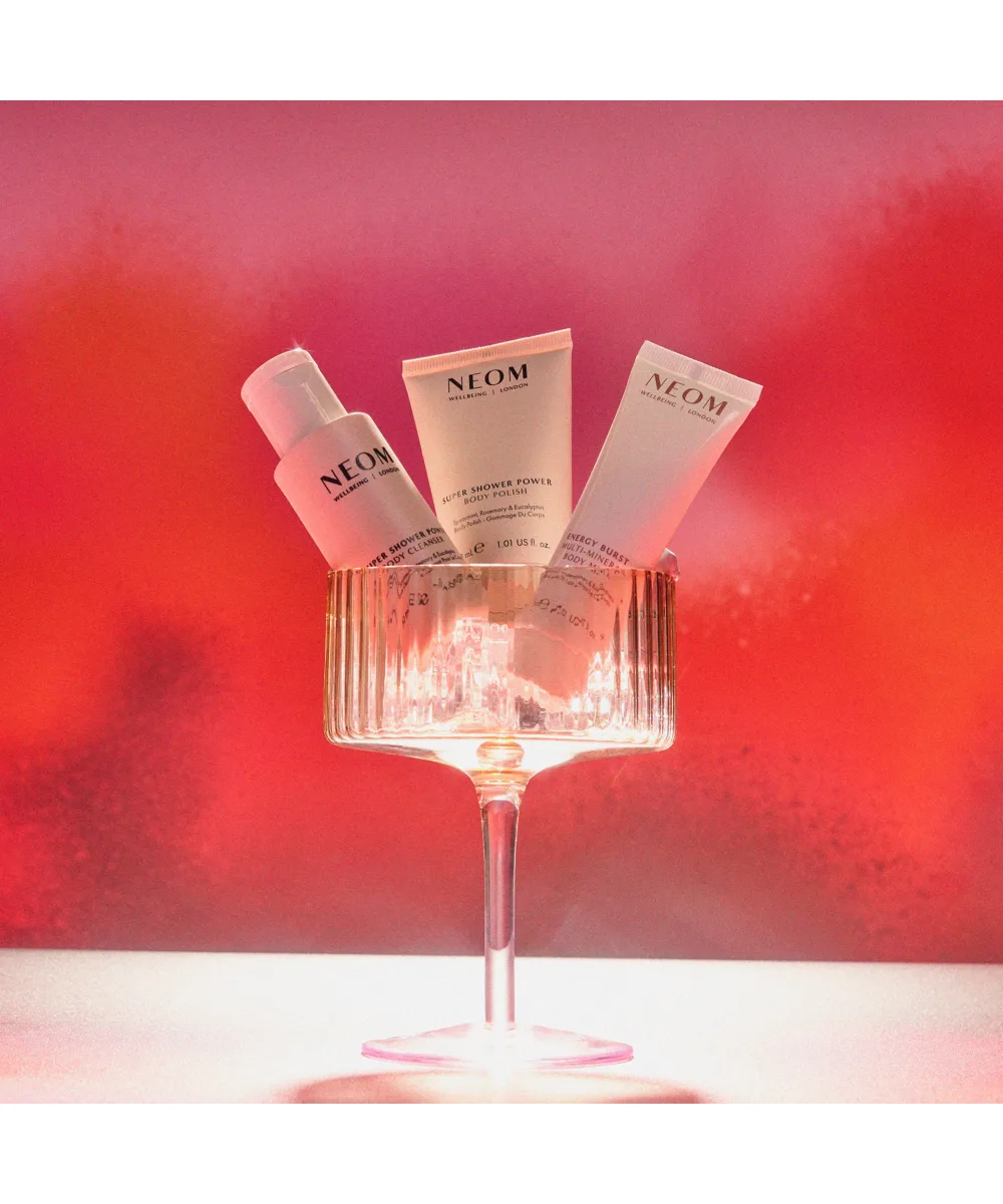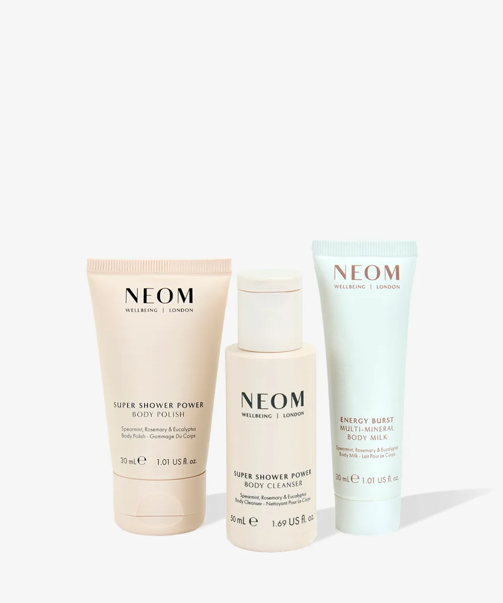 - Super Shower Power Cleanser (30ml): A nourishing body cleanser with 100% natural spearmint, rosemary and eucalyptus essential oils for a boost of energy and hydration.
