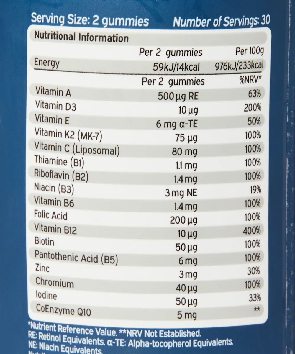 Sweeteners (Maltitol, lsomalt), Water, Liposomal Vitamin C (Vegetable Oil, Cocoa Butter, Isomaltose Syrup, Buffer Salt, Ascorbic Acid), Gelling Agent (Pectin), Acidity Regulators (Citric Acid, Sodium Citrate), Natural Flavourings, Calcium D-Pantothenate, Vitamin E (D-Alpha Tocopheryl Succinate), CoEnzyme Q10, Nicotinamide, Zinc Citrate, Pyridoxine HCl, Riboflavin, Thiamine HCl, Vitamin A (Retinyl Palmitate), Folic Acid, Vitamin K2 (Menaquinone-7), Biotin, Potassium Iodide, Chromium Picolinate, Colouring Food (Strawberry Extract), Vegetable Oil (Coconut Oil, Glazing Agent [Carnauba Wax]), Sweetener (Steviol Glycosides from Stevia), Vitamin B12 (Cyanocobalamin), Vitamin D3 (Cholecalciferol). *Nutrient Reference Value **NRV Not Established RE: Retinol Equivalents ⍺-TE: Alpha-tocopherol Equivalents NE: Niacin Equivalents