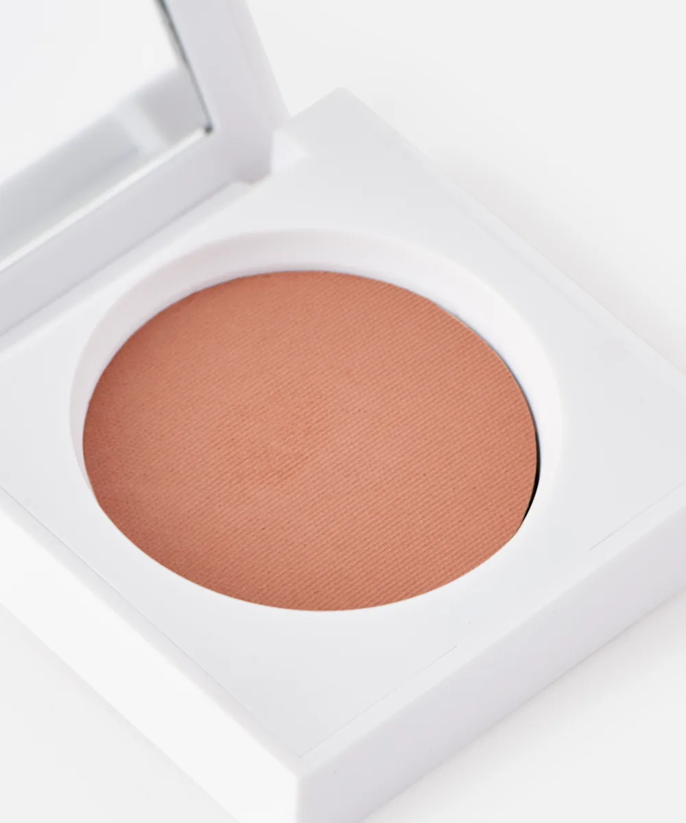 A highly-pigmented pressed powder brush housed within a travel-friendly compact for on-the-go beautification.