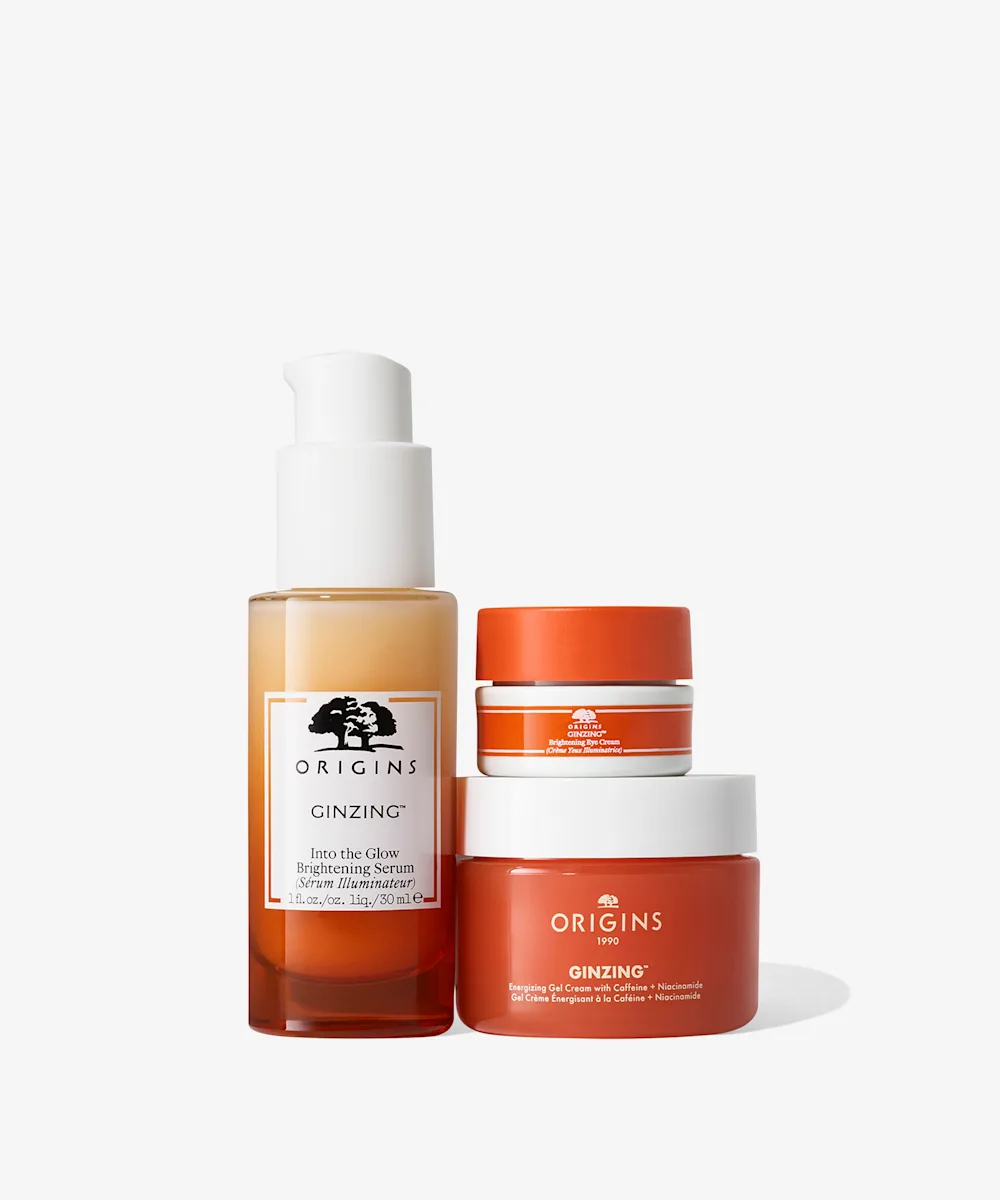 Grow your glow in just three steps with the Plenty of Glow - GinZing™ Essentials to Boost Glow from Origins. Enriched with a blend of radiance-boosting ingredients including vitamin c, niacinamide, hyaluronic acid, caffeine from coffee beans, three forms of panax ginseng, this set has all you need for smoother, brighter skin.
