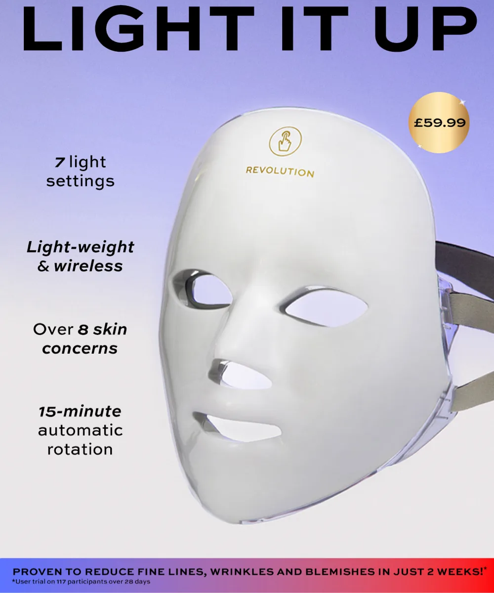 Light up your skincare routine with the Revolution Pro Miracle LED Face Mask, your at-home answer to salon-grade results. Featuring seven targeted light treatments and 90 low-level LED bulbs, this lightweight, wireless mask tackles over eight skin concerns in just 15 minutes. Whether you want to smooth fine lines, diminish blemishes, calm redness or restore radiance, the automatic light rotation makes it easy to personalise your treatment for your skin’s changing needs. Non-invasive and suitable for all skin types, this multi-tasking device is your shortcut to healthier, more luminous-looking skin in just two weeks of consistent use.