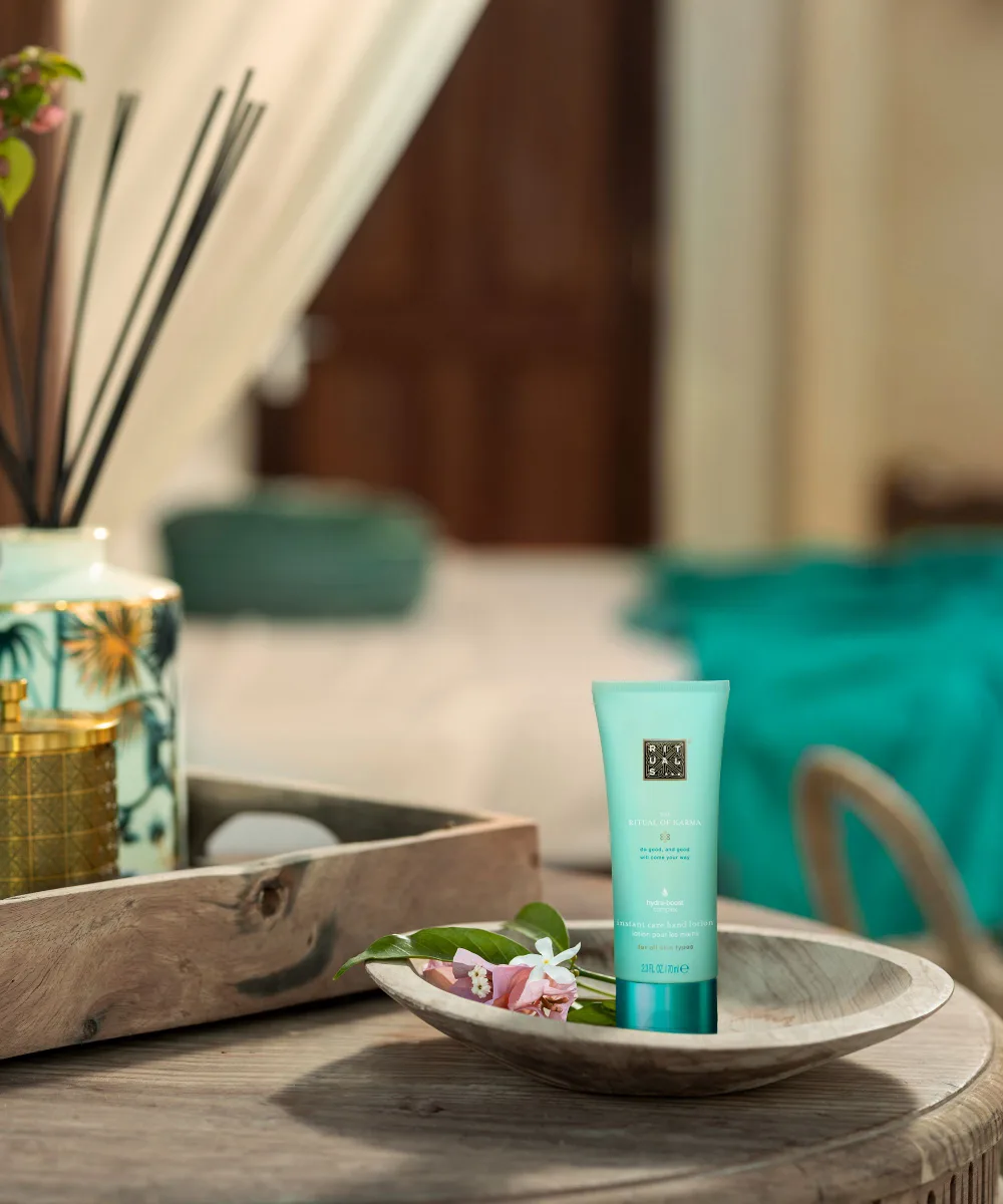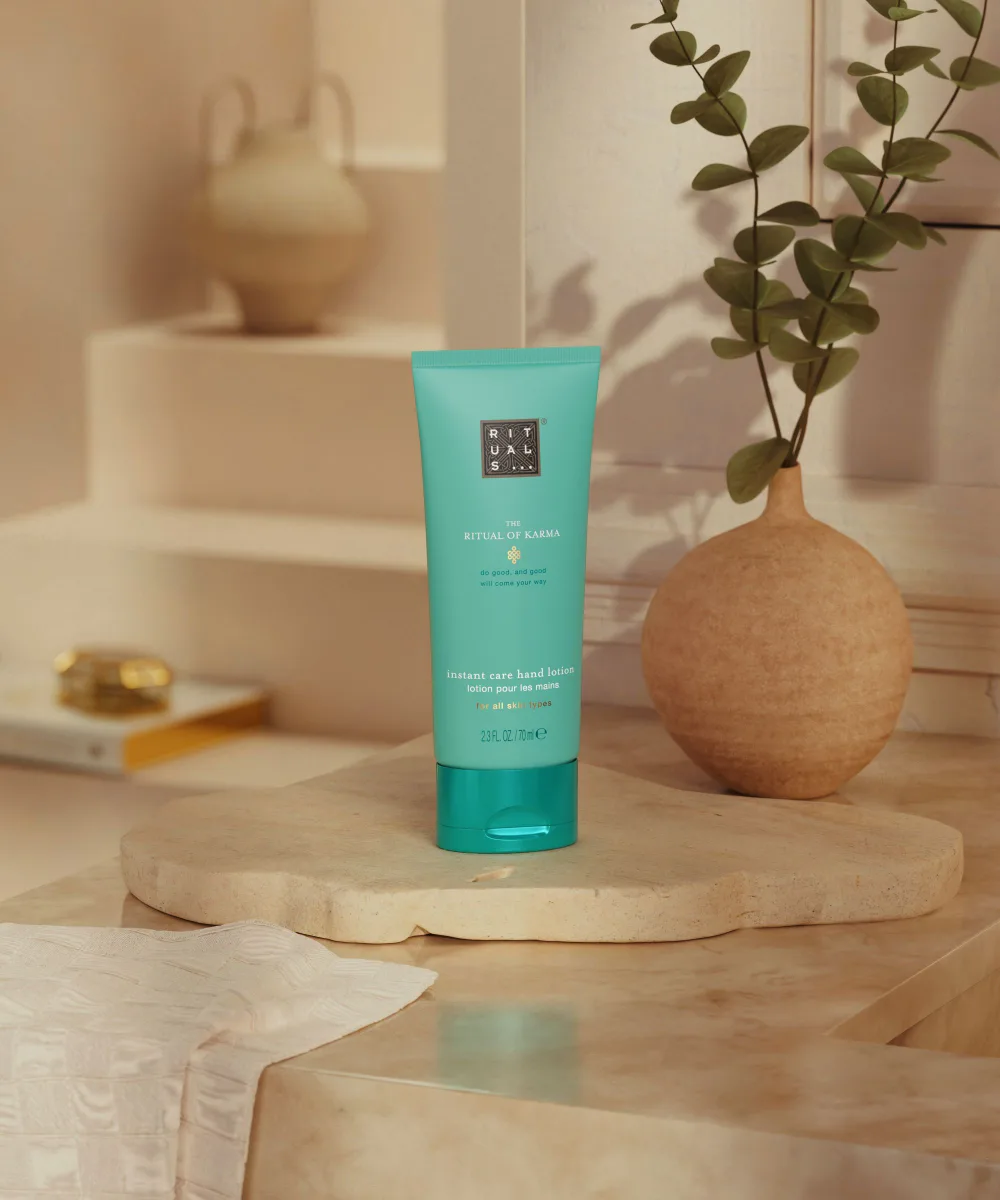 Soothe and soften your hands with The Ritual of Karma Instant Care Hand Lotion from Rituals. Specially developed with over 95% natural ingredients, this lightweight formula absorbs quickly, leaving skin feeling silky and nourished without greasiness. Infused with the uplifting fragrance of lotus flower and white tea, it transforms hand care into a moment of indulgence. Enhanced with microbiome-friendly ingredients, it helps to strengthen the skin barrier, supporting balance and long-lasting skin health.
