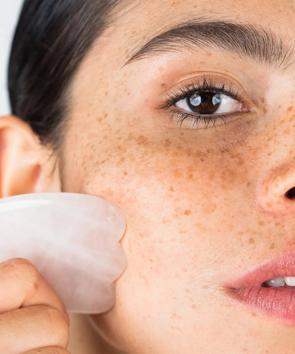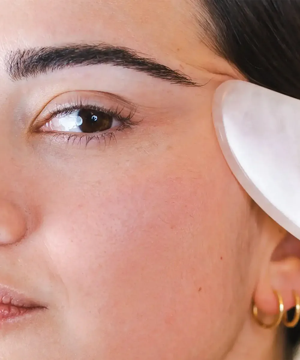 - With the Gua Sha flat along the cheek, stretch from the inside out to smooth the cheekbones towards the temples.