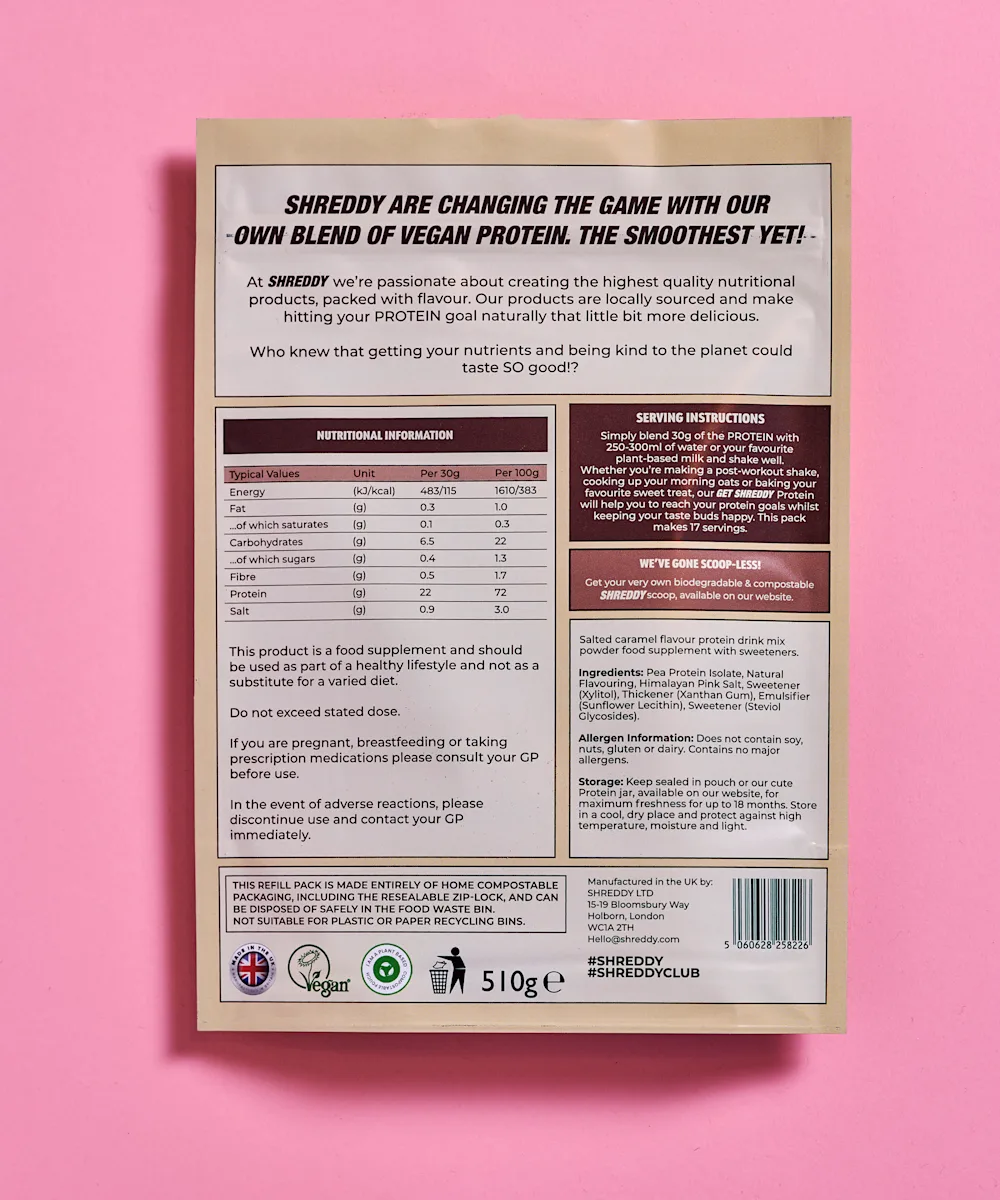 Dessert delicious and totally nutritious, the Shreddy Salted Caramel Ice Cream Protein is here to help you hit your protein goals. Made with 100% vegan pea protein plus a touch of pink himalayan salt, is this super smooth and light protein powder that makes getting in your nutrients and looking after the planet so easy. The no-nasties, vegan formula delivers 22g of protein per serving, and comes packaged in fully compostable packaging. It’s time to get shreddy.