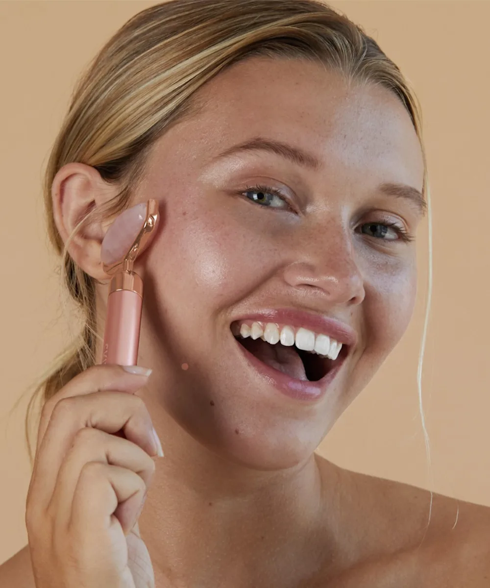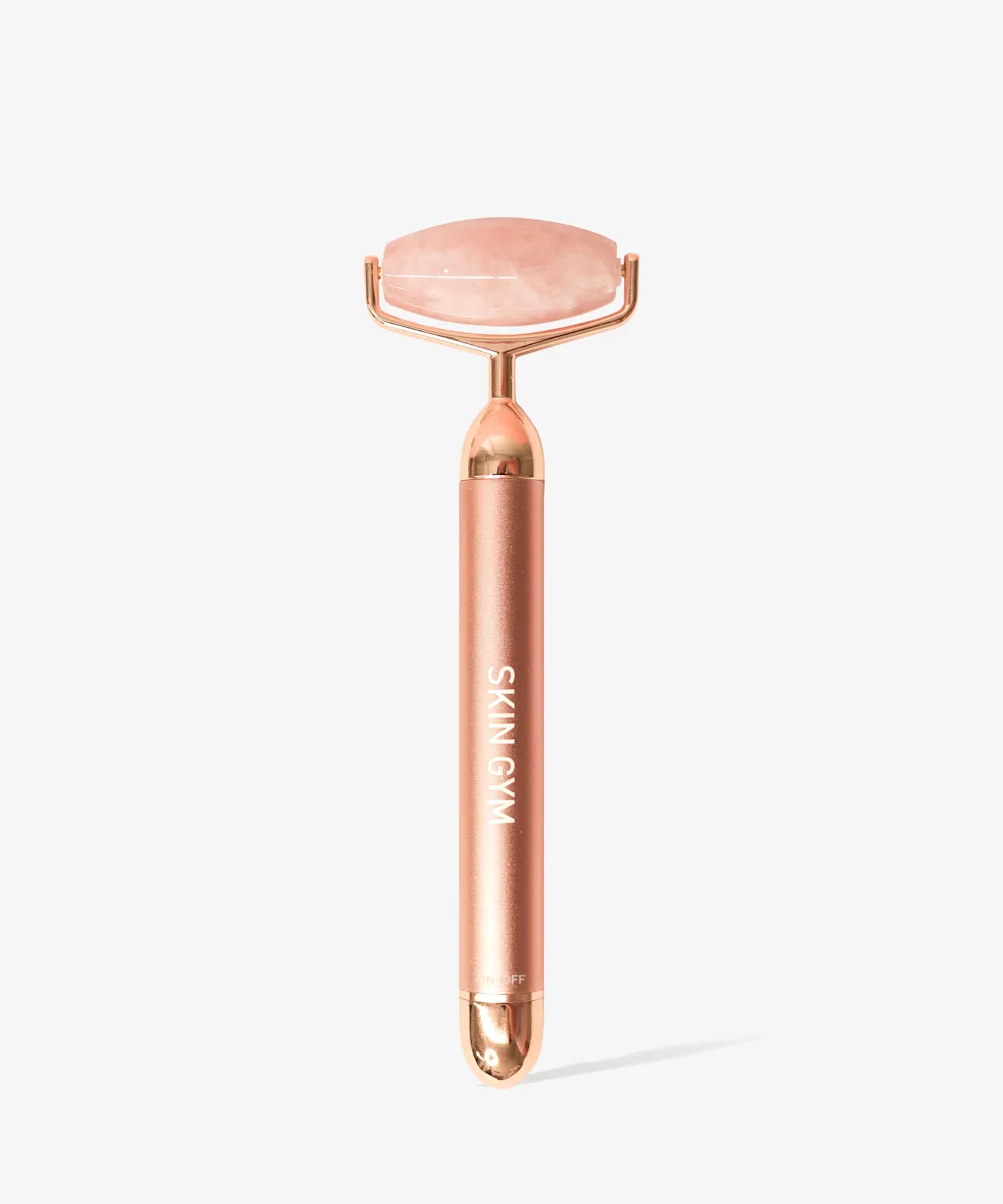 A vibrating rose quartz facial roller.