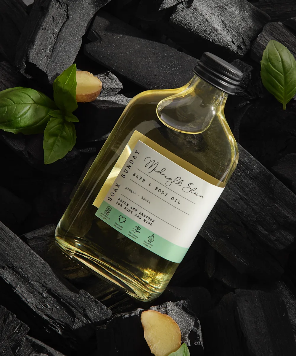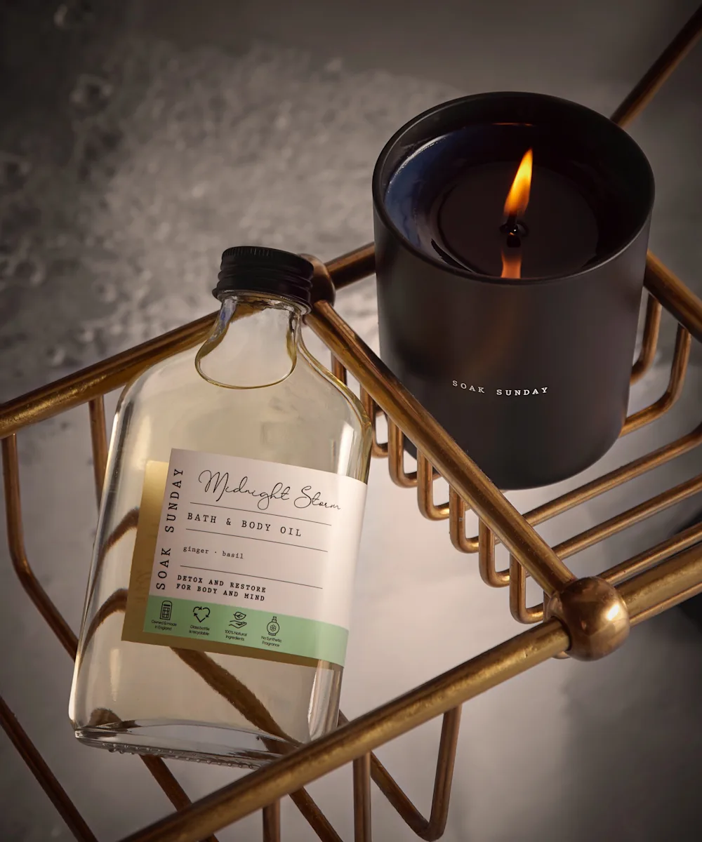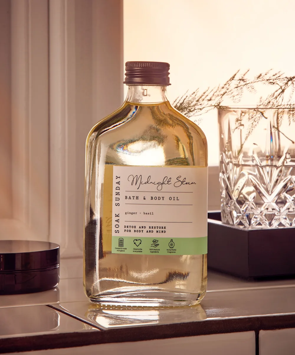 Drench yourself in Soak Sunday’s Midnight Storm Bath and Body Oil. Soothe both your skin and mind with the blend of nourishing almond and manuka oil, rejuvenating ginger, detoxifying basil and indulgent jojoba oil. This calming bath and body oil can be used in the tub or directly on the skin… and breathe.