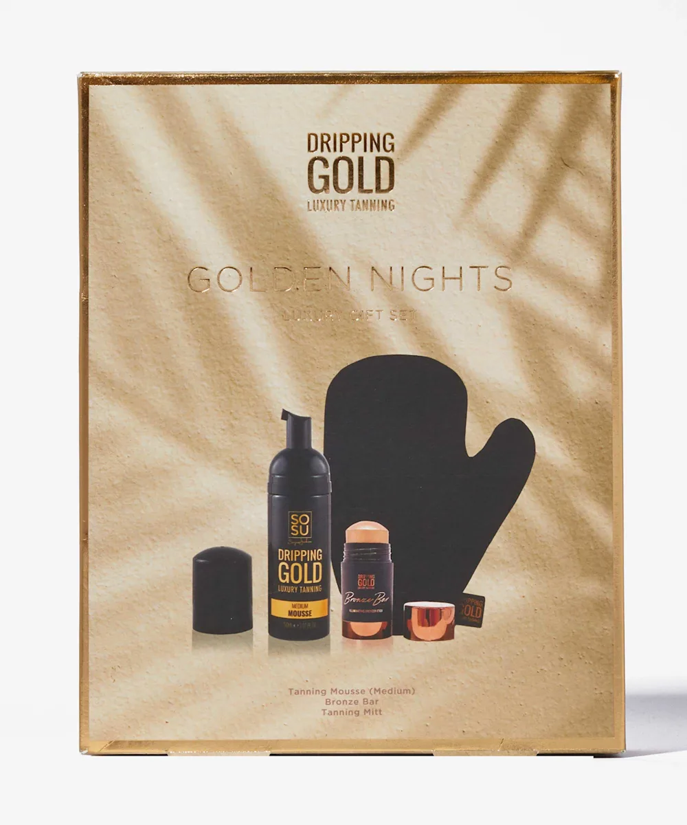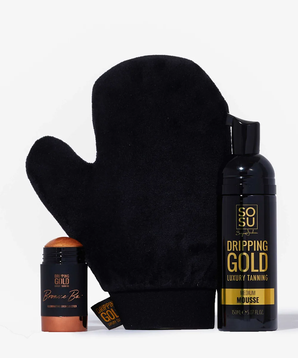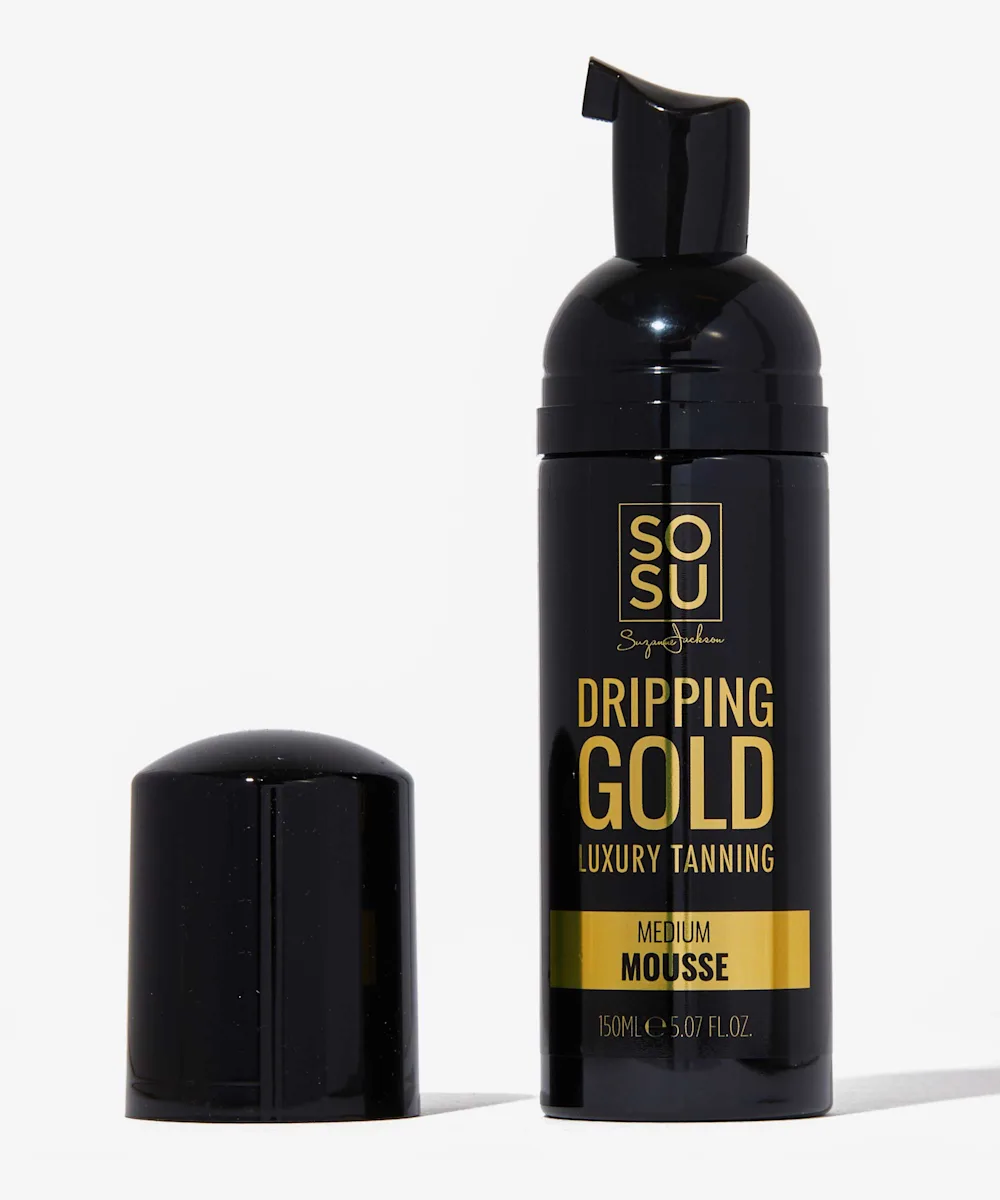 - Dripping Gold Luxury Tanning Mousse ‘Medium’ – A hydrating false-tanning mousse in a medium shade