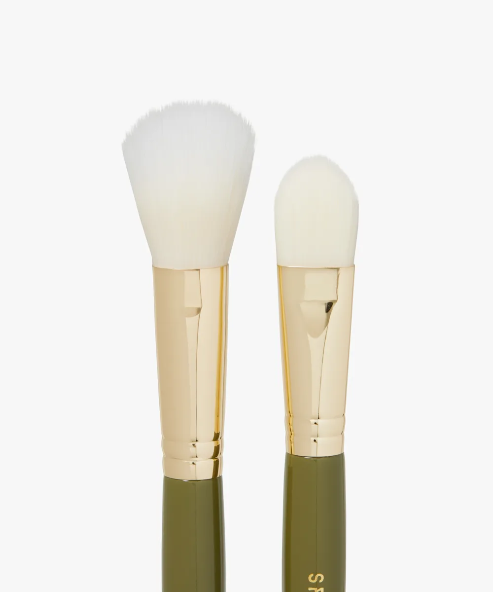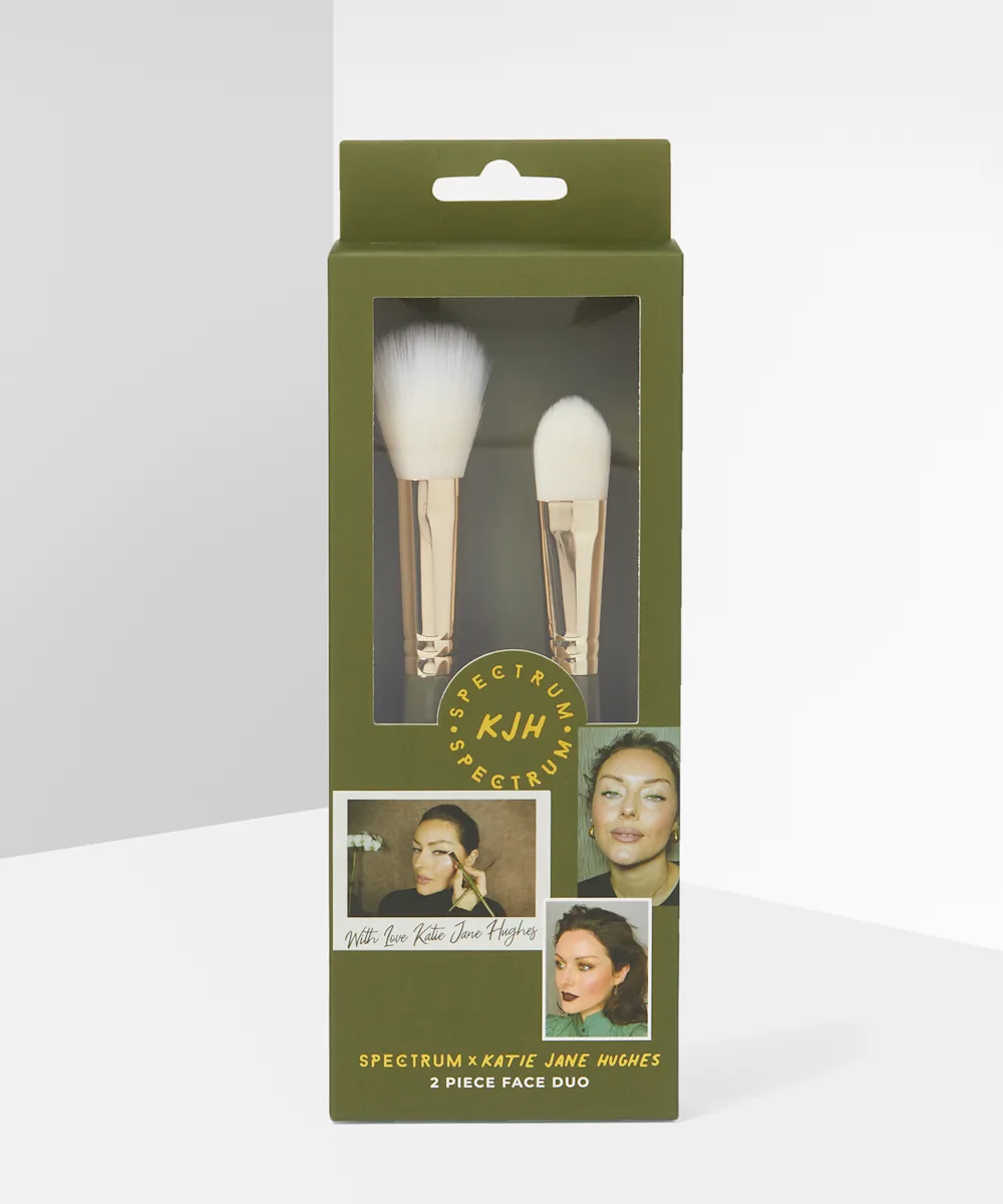 Inspired by the professionals, the Spectrum KJH 2 Piece Face Brush Set is the perfect set for applying and blending your fave wet or dry base products, for a glowy and seamless finish. Inside this set you’ll find a duo-fibre cheek brush, perfect for foundation or placing contour, plus an easy-to-use foundation brush. Each luxe, gold and olive toned brush features cream coloured firm yet flexible synthetic bristles and will fit perfectly in your existing collection.