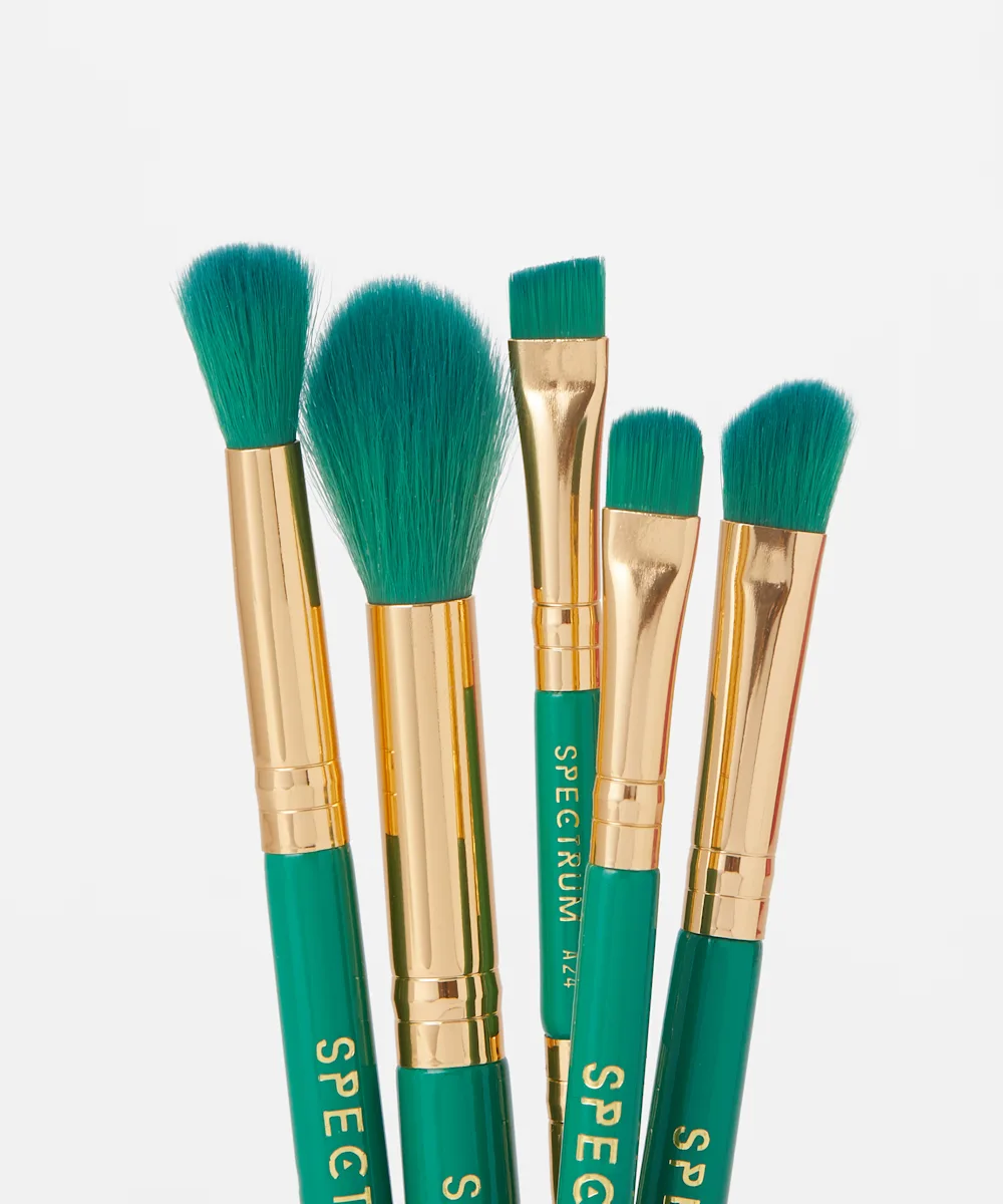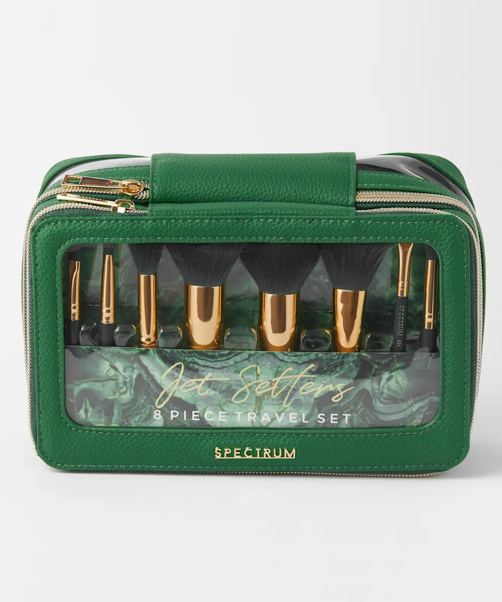 Get perfect makeup looks wherever you are with the Spectrum Malachite Jet Setter. This luxury makeup bag contains an eight-piece luxury travel set of mini brushes for you to buff and blend the best makeup looks. The two-tier cosmetics case and vegan-friendly brushes both feature a luxury green and gold design. The ideal match for taking your beauty essentials wherever you go.