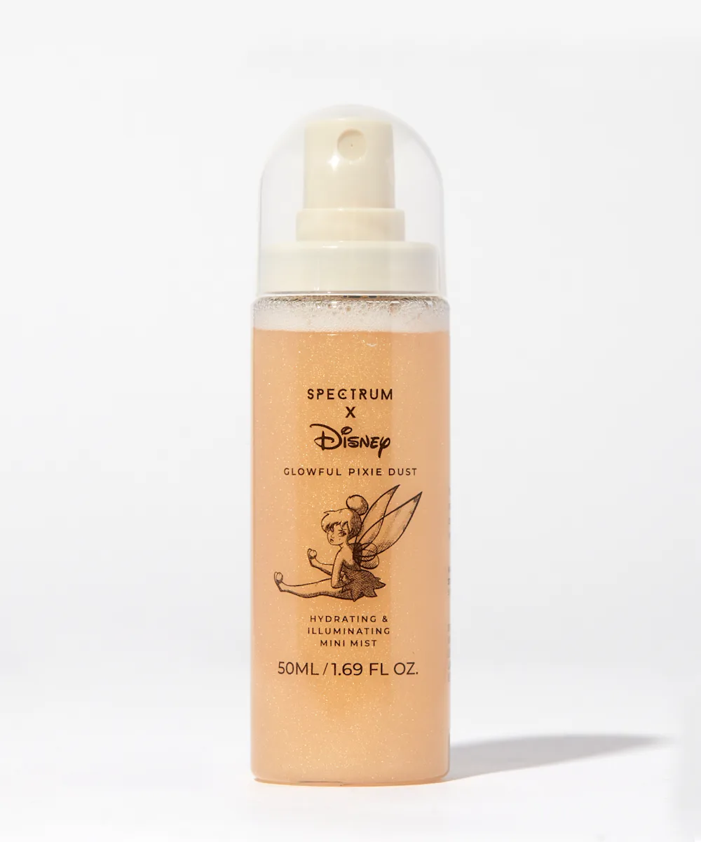Powered by pixie dust, the Spectrum Collections Tinker Bell Pixie Dust Mini Glowful Mist belongs in your next haul. With a sweet peaches and cream fragrance, this ultra-fine mini mist is packed with moisture boosting glycerin and hyaluronic acid, plus pink grapefruit extract and vitamin C to brighten skin while adding a subtle champagne shimmer for a magical glow.