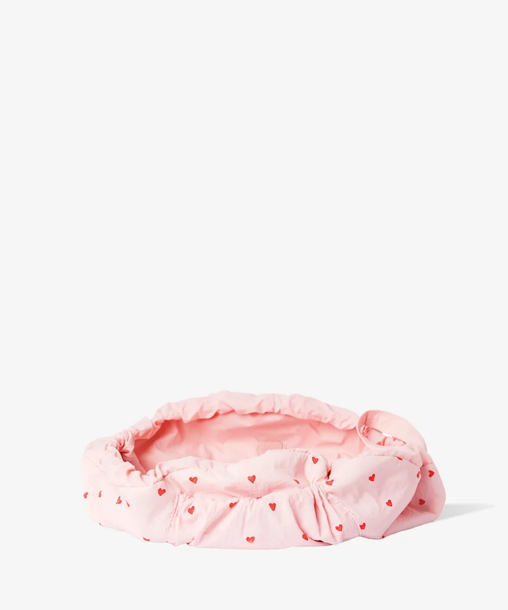 A soft pink drawstring makeup bag with a red heart design.