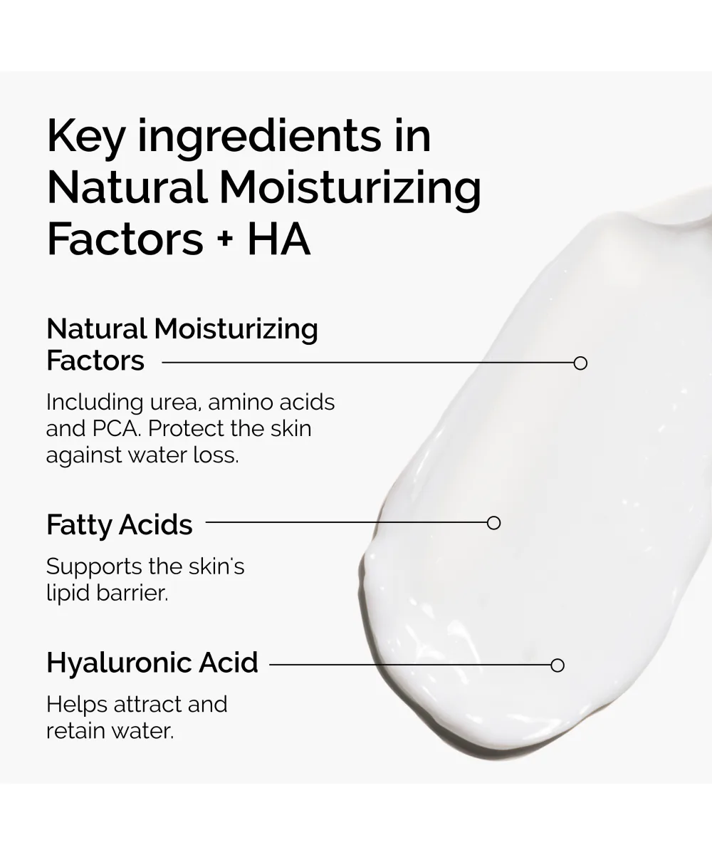 Natural Moisturizing Factors + HA: Aqua (Water), Caprylic/Capric Triglyceride, Cetyl Alcohol, Propanediol, Stearyl Alcohol, Glycerin, Sodium Hyaluronate, Arginine, Aspartic Acid, Glycine, Alanine, Serine, Valine, Isoleucine, Proline, Threonine, Histidine, Phenylalanine, Glucose, Maltose, Fructose, Trehalose, Sodium PCA, PCA, Sodium Lactate, Urea, Allantoin, Linoleic Acid, Oleic Acid, Phytosteryl Canola Glycerides, Palmitic Acid, Stearic Acid, Lecithin, Triolein, Tocopherol, Carbomer, Isoceteth-20, Polysorbate 60, Sodium Chloride, Citric Acid, Trisodium Ethylenediamine Disuccinate, Pentylene Glycol, Triethanolamine, Sodium Hydroxide, Phenoxyethanol, Chlorphenesin.
