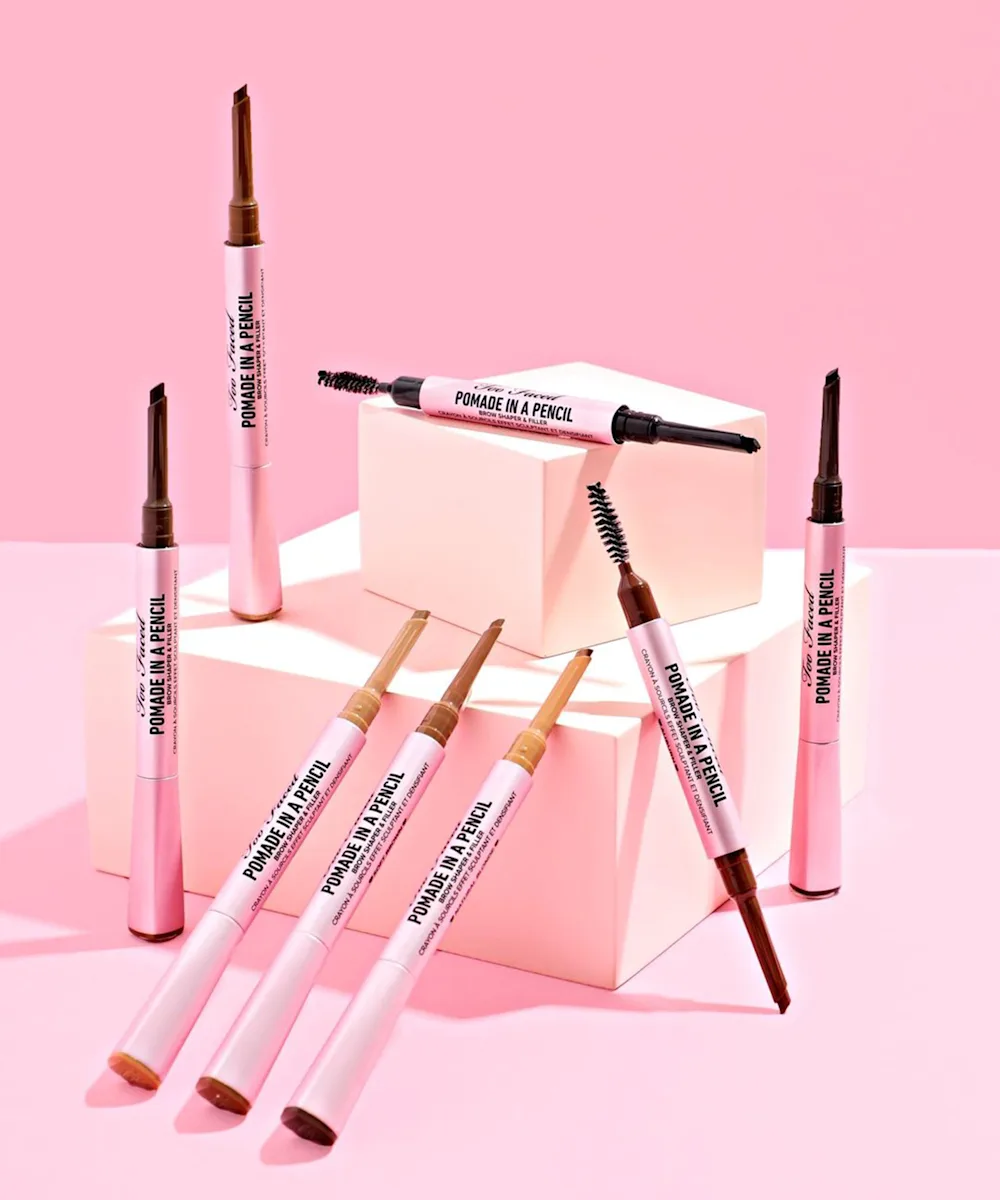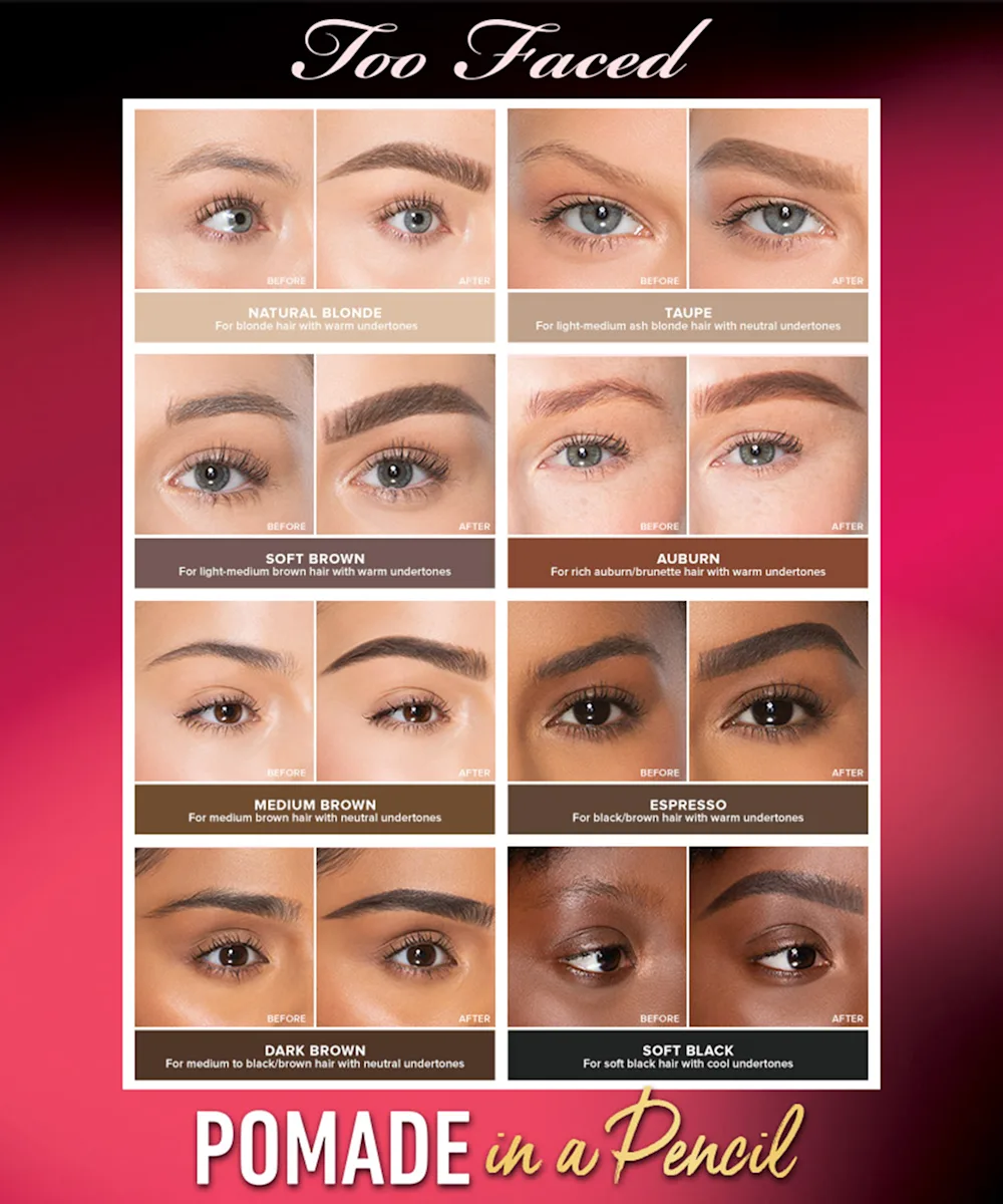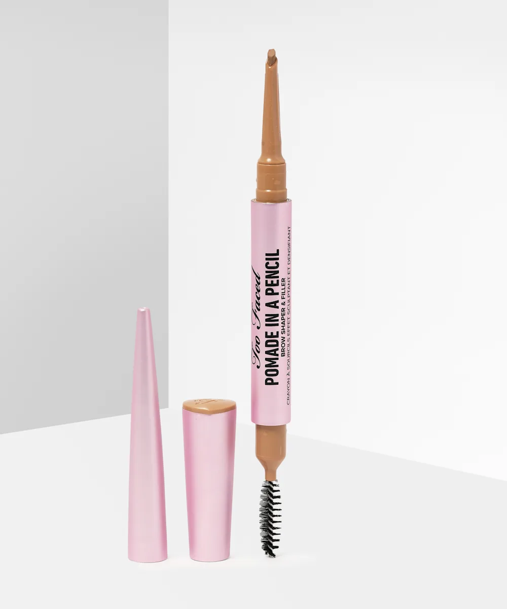 Love the finish of a pomade but the ease of a pencil? Then Too Face have got it covered. Introducing the Brow Pomade In A Pencil β a creamy pomade in an easy-to-use pencil format. The ultra-pigmented formula glides seamlessly onto brows to fill in any spare areas, add definition, and enhance your natural brows. The long-wasting, creamy wax formula sets brows in place for a waterproof finish that lasts for up to 36 hours β no fading and no smudging. Brush through the brows with the spoolie end for the perfect finish.
