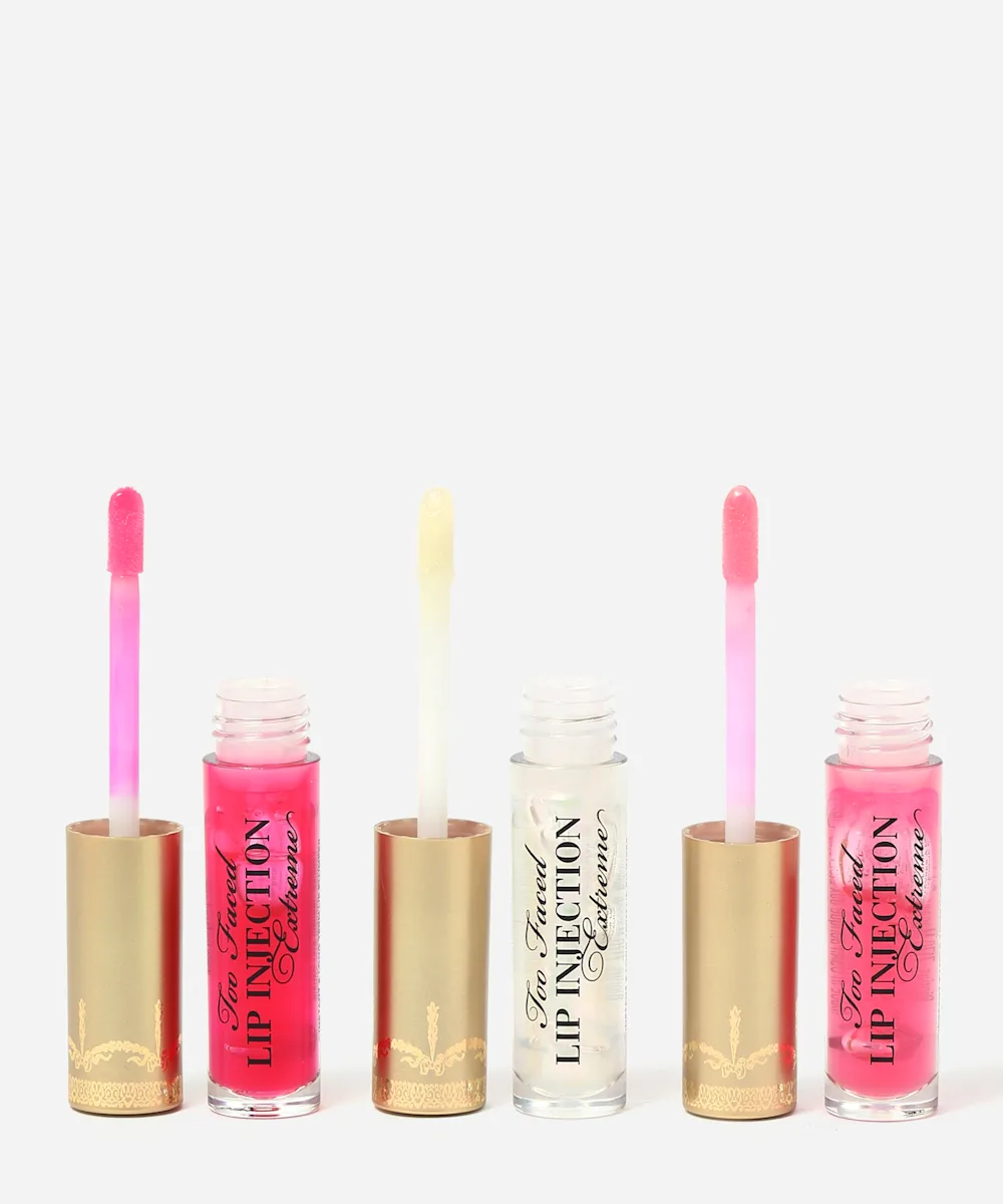 Take your lips to the max with Too Facedβs limited-edition Lip Injection Extreme Plumped To The Max Set. Featuring three of the iconic doll-sized lip glosses, the set is the ultimate gift for any plump lip lover (even if that is yourself!) The set includes the Lip Injection Extreme Original, Bubblegum Yum, and Strawberry Kiss, each designed to help to deliver both immediate and long-term plumping while hydrating and nourishing the lips.