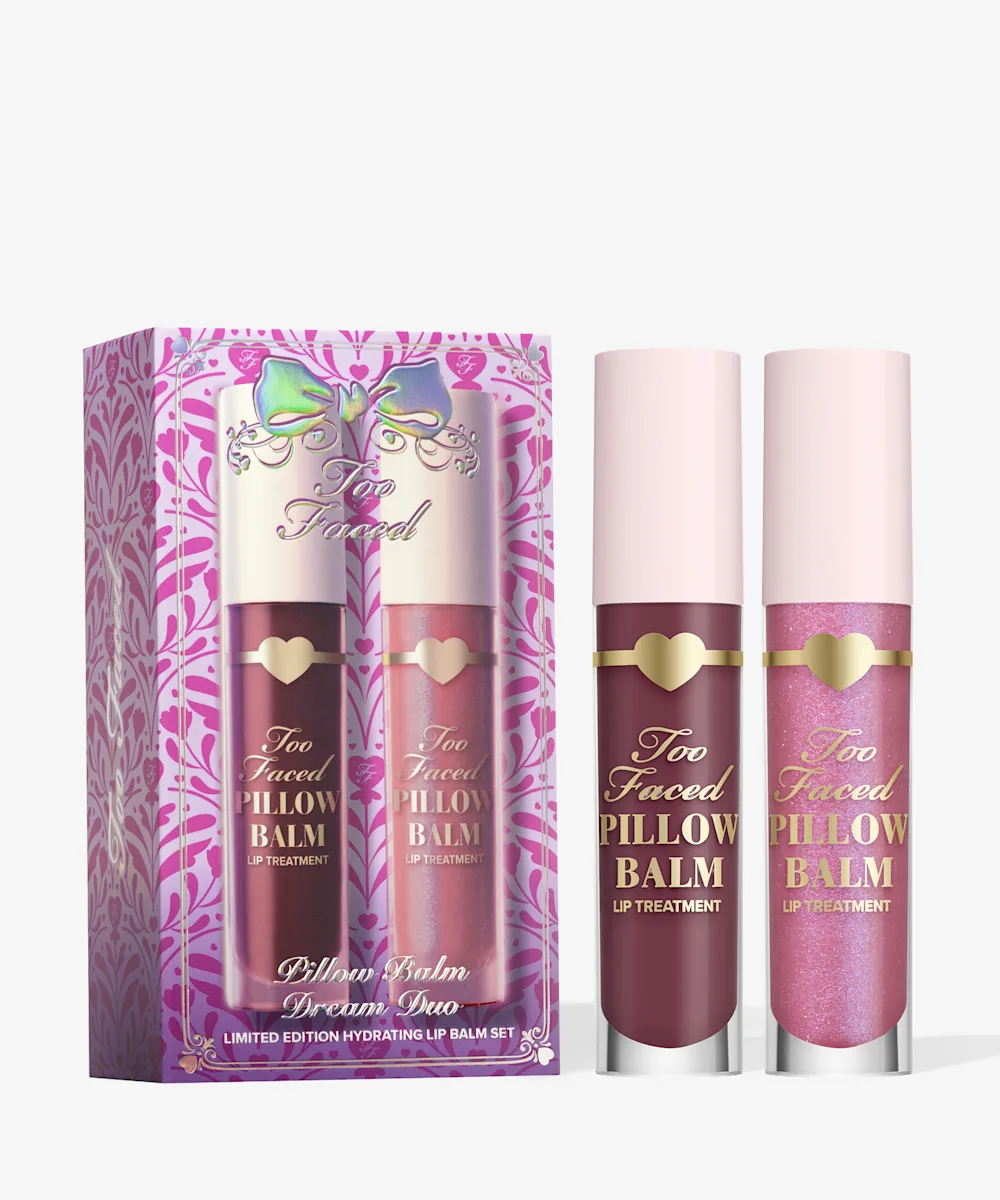 Indulge in pillowy-soft lips with the Too Faced Pillow Balm Dream Duo. This limited-edition set includes two full-size liquid balms infused with ultra-hydrating hyaluronic acid to cushion, smooth, and replenish. The exclusive Fairy Kiss shade offers a dreamy new tint, while Berry Jam Kiss delivers a sweet, flattering flush of colour. With a rich, creamy texture that glides comfortably across lips, each balm leaves a healthy-looking sheen and a plumped, moisturised finish. Perfect for gifting - or keeping all to yourself.