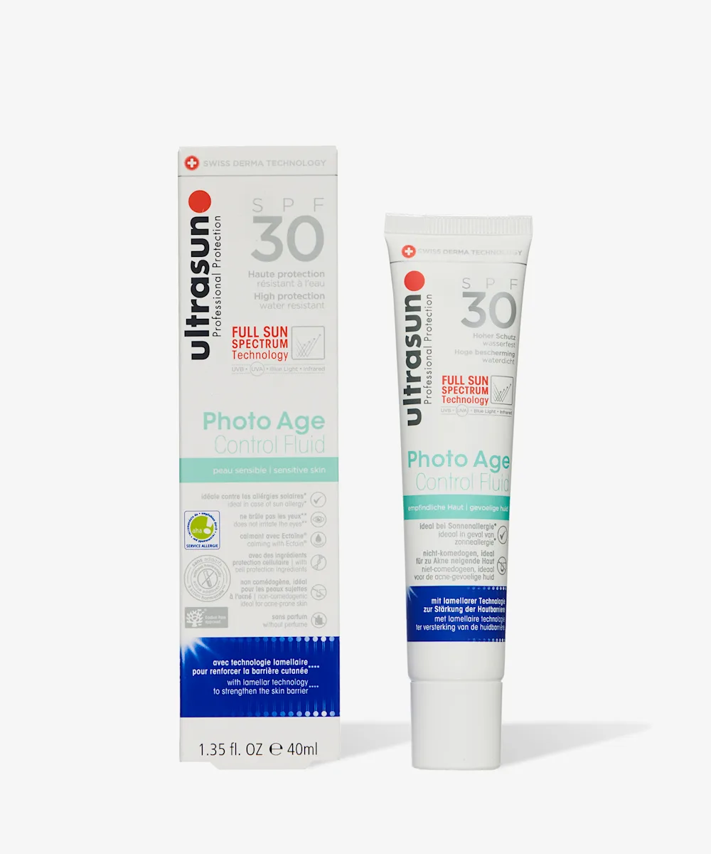 Shield your skin with the solar protection of Ultrasun Photo Age Control Fluid SPF30. This long-lasting formula defends the skin against harmful sun rays with SPF 30 and protects cell membranes from oxidative stress, inflammation, and damage with ectoin. And to minimise sun-induced skin ageing, this unique formula boosts and fortifies the skin barrier without congesting the pores. Perfect for everyday use (even for the most sensitive skin types), this water-resistant fluid acts as an all-in-one primer, moisturiser, and SPF with a super-lightweight, barely-there feel.