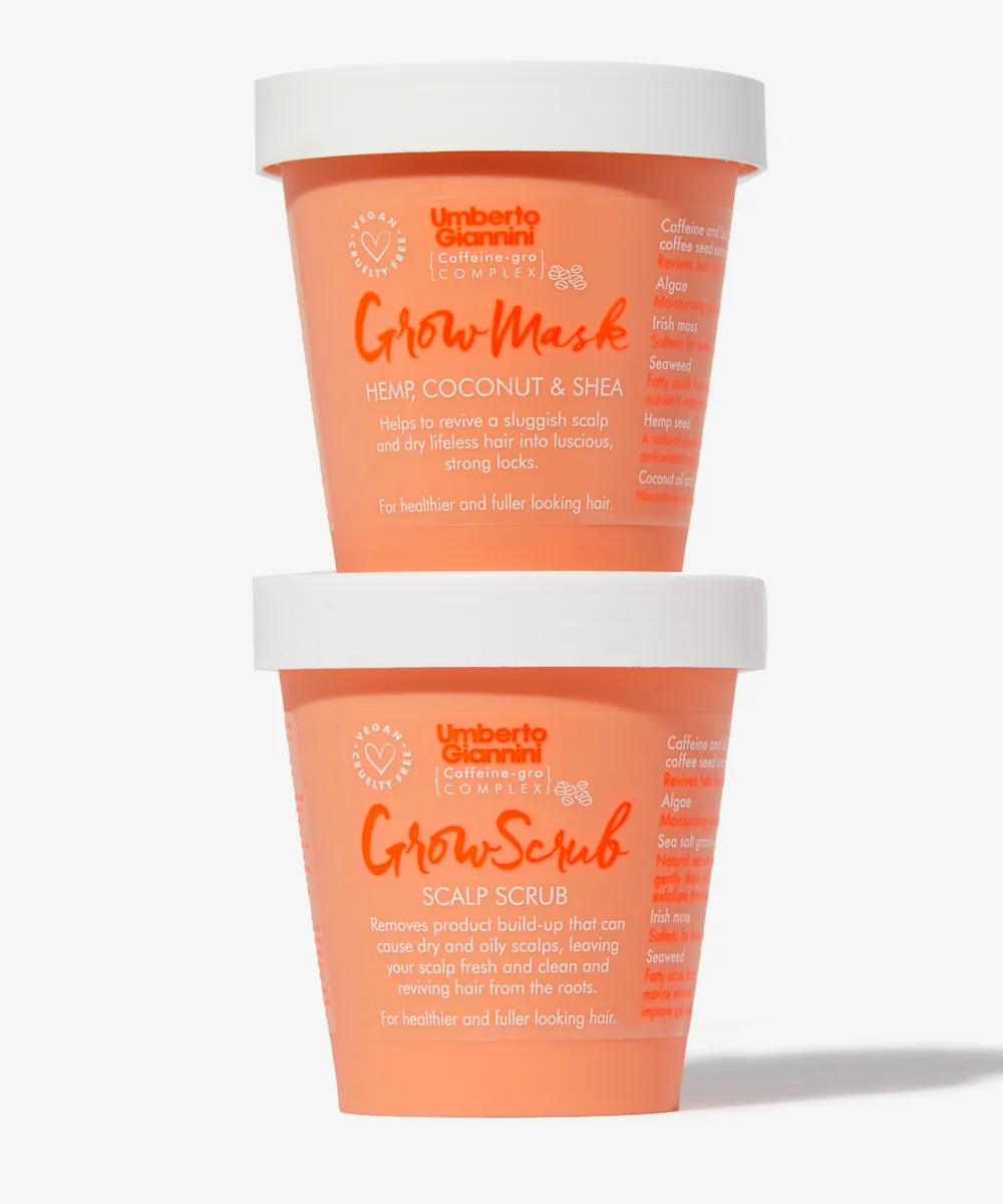 - Grow Scalp Scrub 250g – A scalp exfoliating scrub that helps to remove product build up and dry skin, while working to unblock hair follicles to accelerate hair growth