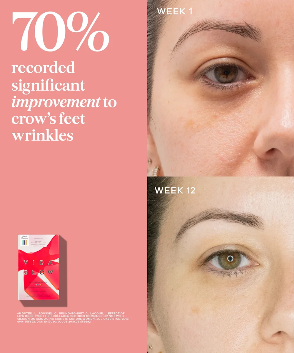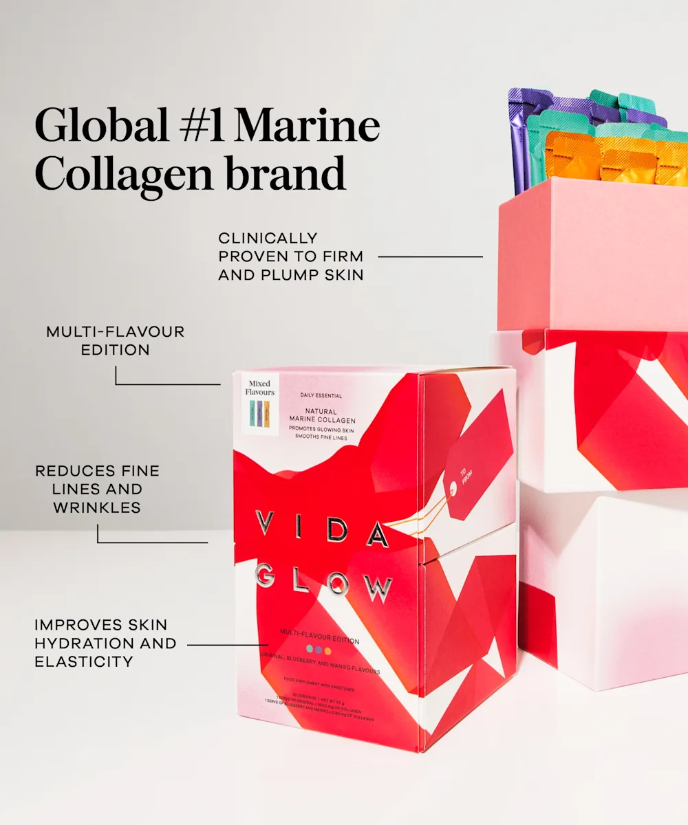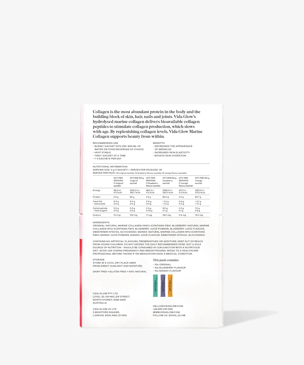 Put the spring back into your skin from within with the Vida Glow Marine Collagen Multi-Flavour Edition. Designed to support the natural ageing process, these collagen peptide supplements are formulated with fish skin and activated to maximise absorption and stimulate collagen production. These sachets are clinically proven to smooth fine lines and wrinkles, boost skin firmness, enhance elasticity, encourage and maintain healthy hair, and promote nail growth and strength. Infused with real mango for a subtle sweetness, these sachets can easily be incorporated into your daily routine by mixing them into any food or drink. With three different yummy flavours to choose from, these sachets belong in your daily routine.